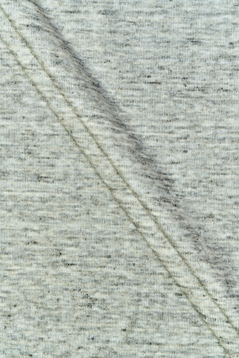 Włoska dzianina dwuwarstwowa w kolorze jasnego szarego melanżu - prawa strona pętelka, lewa gładka, śmietanowa . Materiał ma lekko luźny splot, ale jest dość kryjący, elastyczny, średniej grubości, pochodzi z kolekcji znanego domu mody. Doskonale sprawdzi się na codzienną odzież taką jak bluzy, marynarki, sukienki, spódnice.