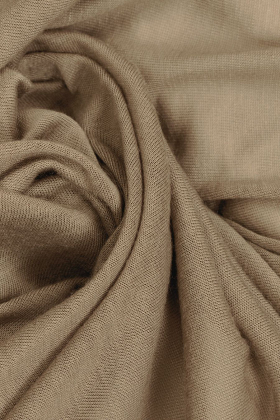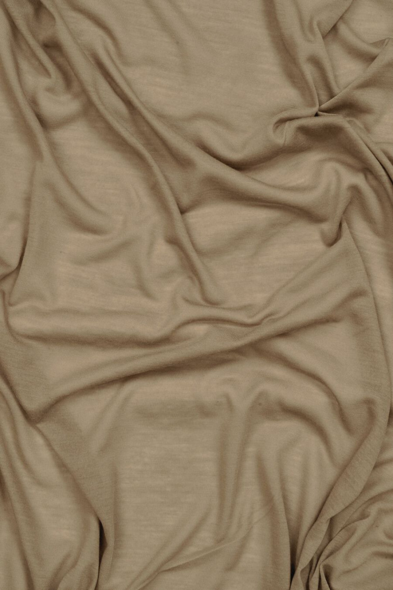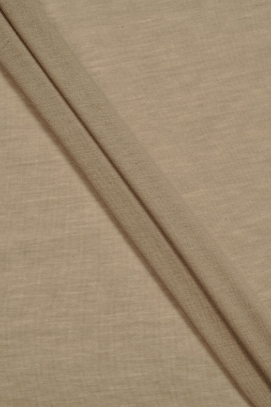 Włoska dzianina poliestrowa kolorze ciemnego beżu. Dzianina jest cienka, transparentna, miękka, matowa i elastyczna. Polecamy na bluzki, topy, koszulki, można również użyć jej jako podszewki.
