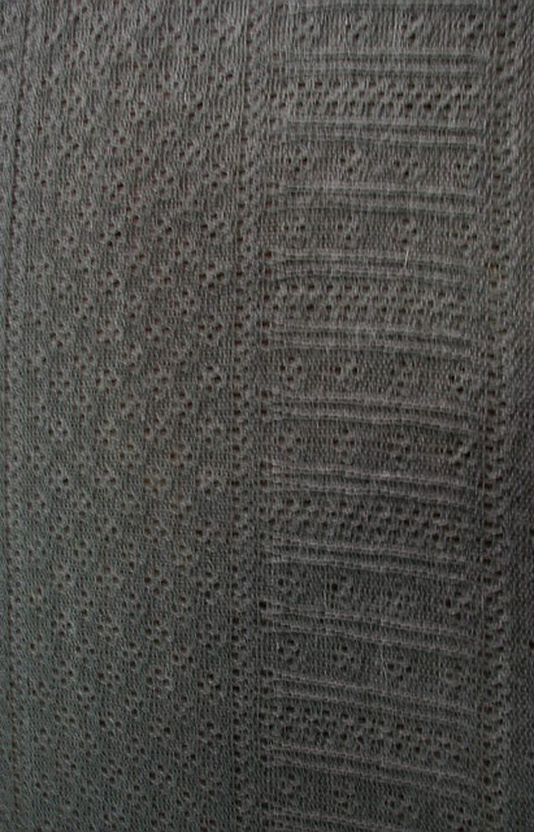 Dzianina swetrowa ażur utkana z nitek akrylu i wełny w kolorze jasnego popielu.