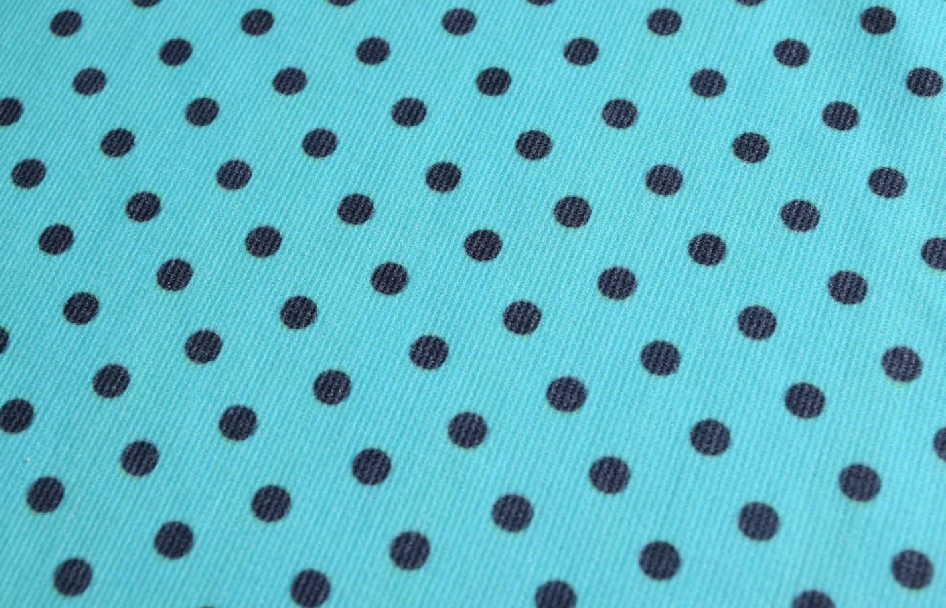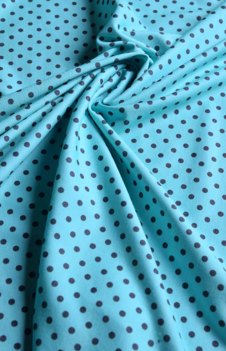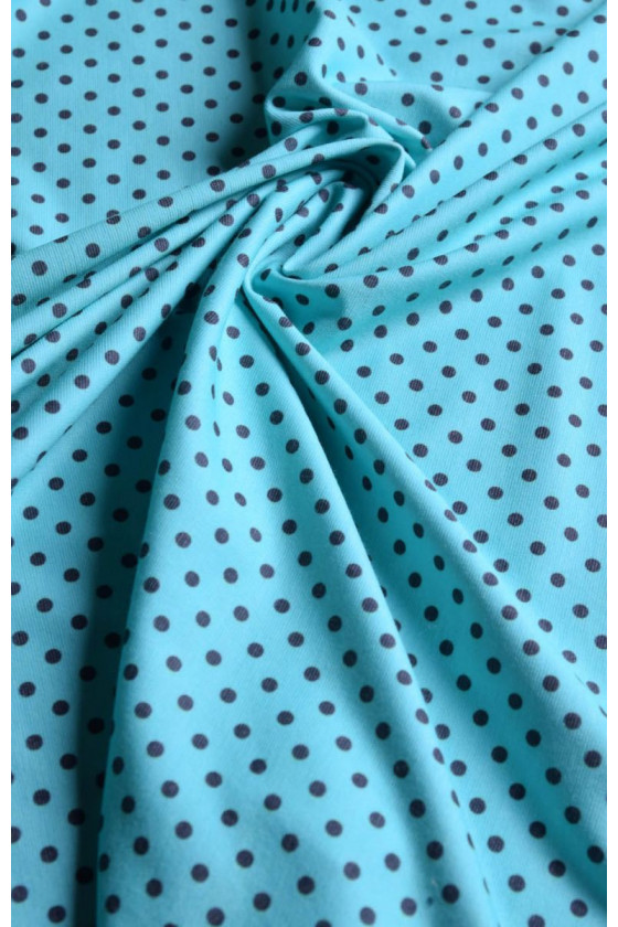 Elastyczna dzianina typu jersey w kropki, średniej grubości z przeznaczeniem na sukienki, spódnice, dzianinowe marynarki. Groszki wielkości ok. 0.5 cm.