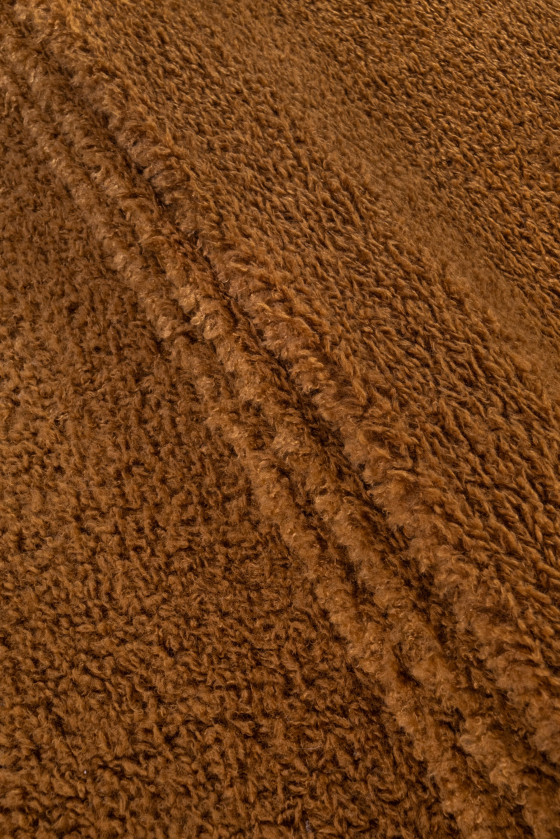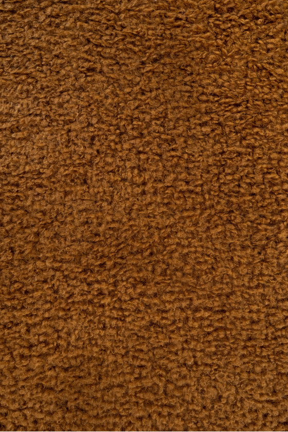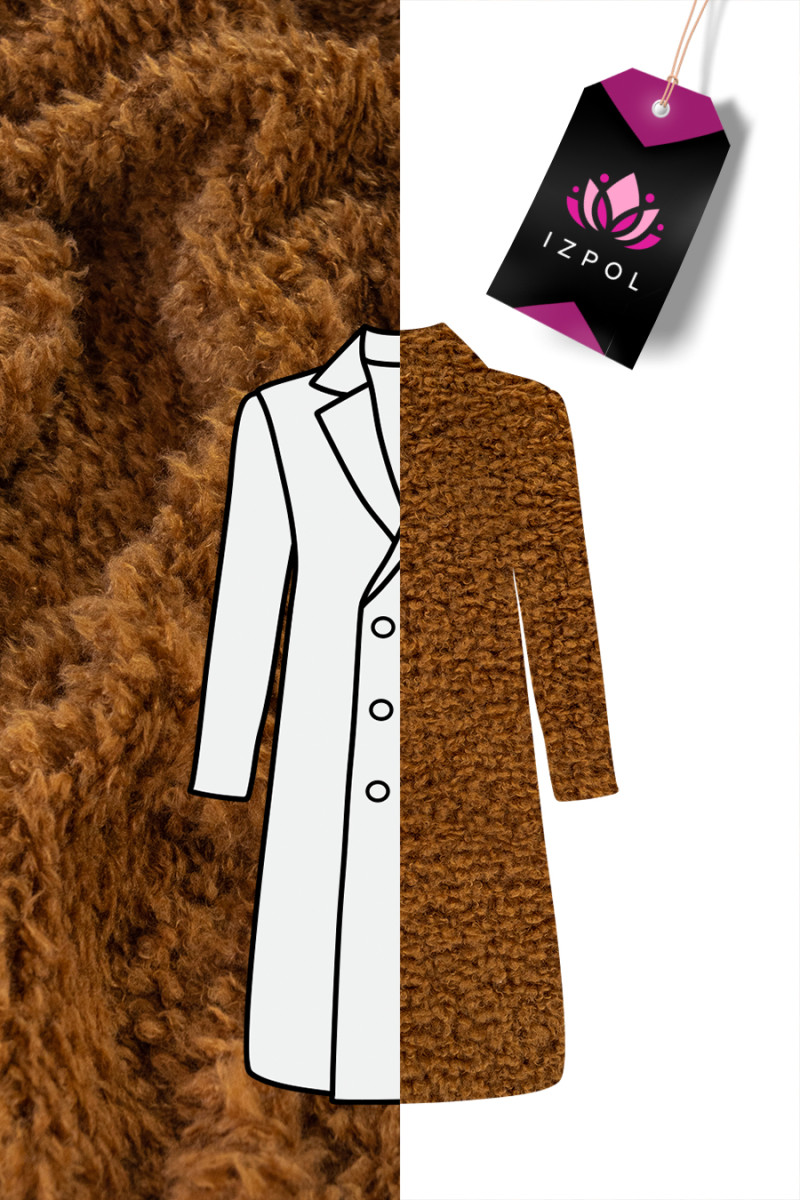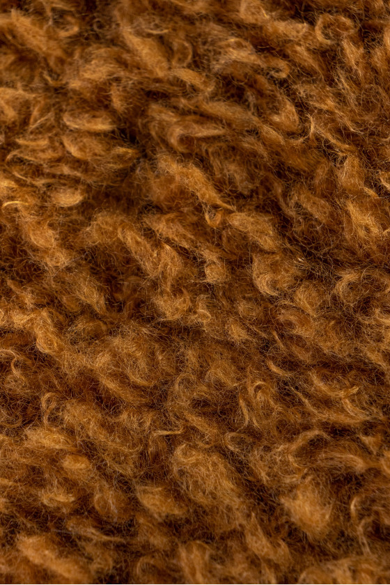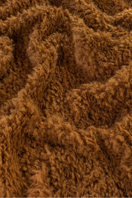 Włoska tkanina typu ekofutro w kolorze kamelowym. Tkanina bardzo miękka z kręconym, dłuższym włosem przypominającym moher - idealna do uszycia płaszcza, kurtki, kamizelki lub na wykończenia.
