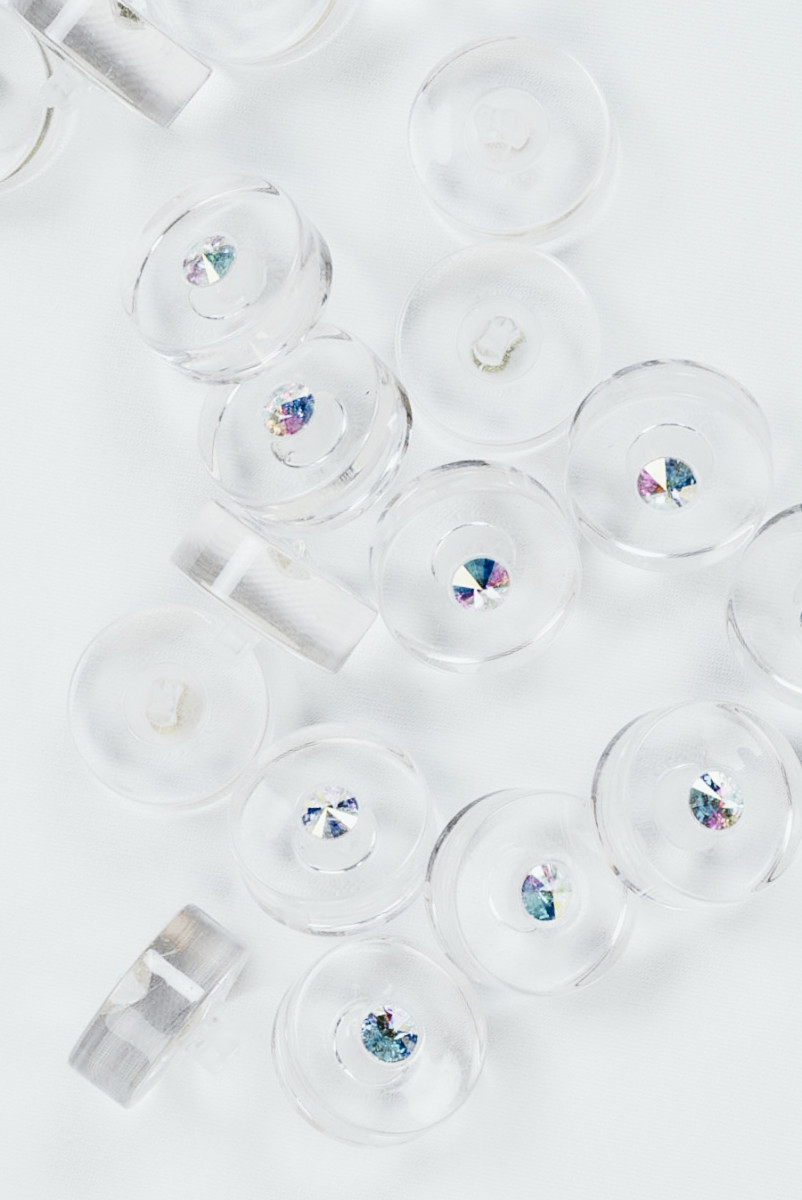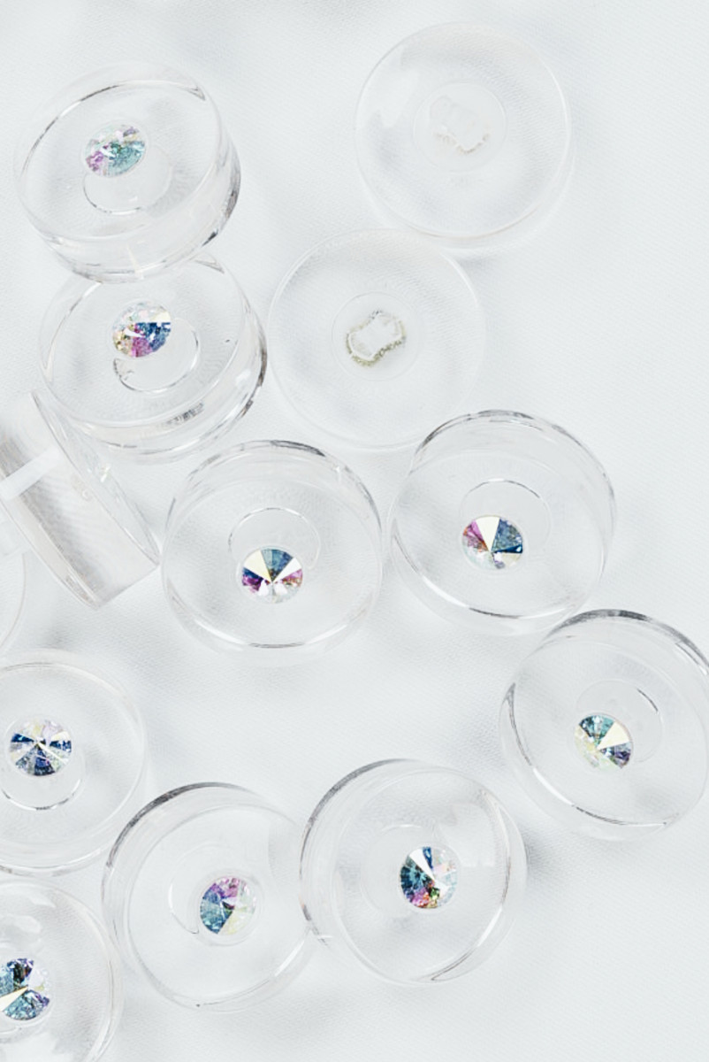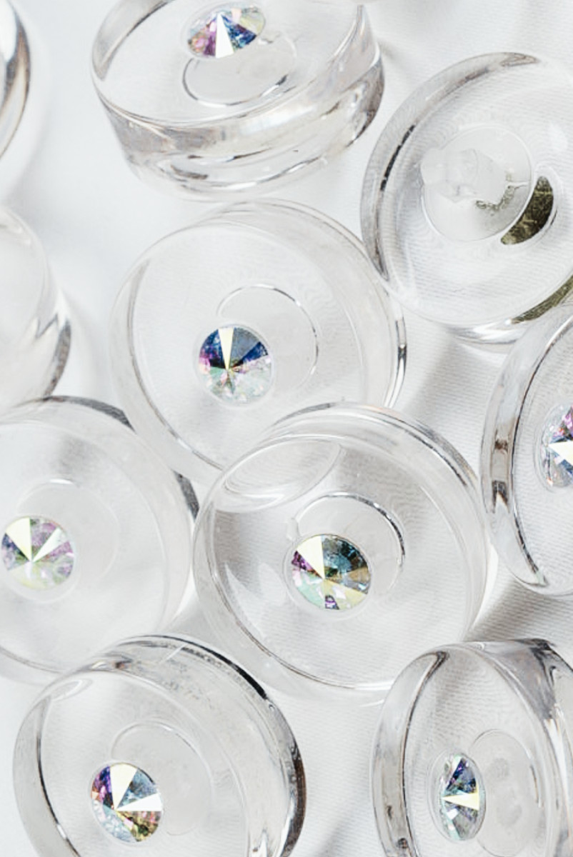 Włoski, przeźroczysty guzik o średnicy 2cm i grubości 0,8cm. Dodatkowo jest on ozdobiony w środku hologramowym kamieniem, który mieni się w różnych kolorach - w zależności od kąta padania światła. Guzik jest bardzo efektowny i lekki. Ze względu na wielkość idealne sprawdzi się do wzbogacenia żakietu, marynarki, kamizelki lub spódnicy.