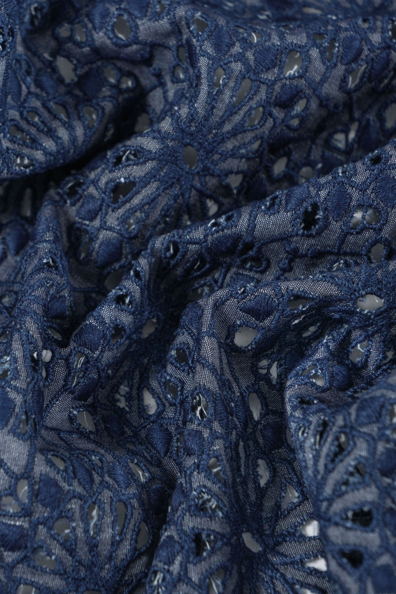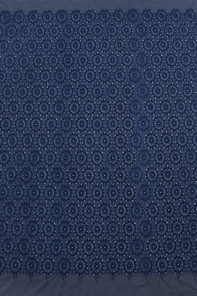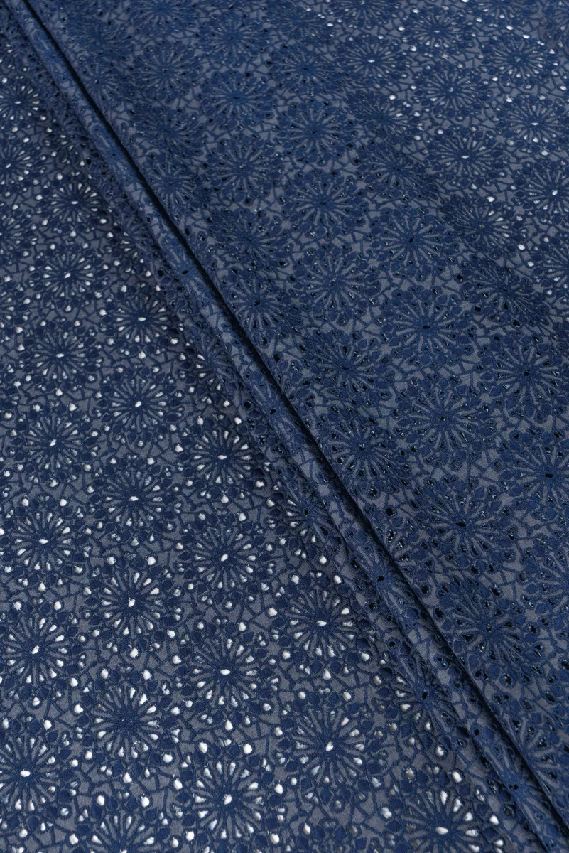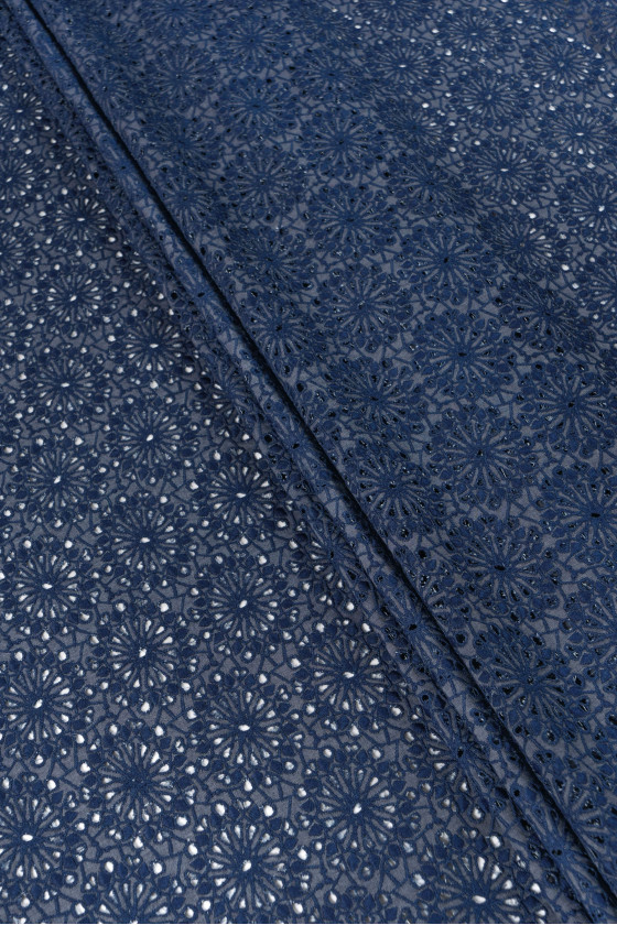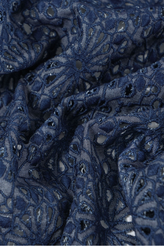 Włoska tkanina bawełniana przypominająca cienki jeans w kolorze szaro-granatowym z granatowym haftem ażurowym. Tkanina ma szerokość 155 cm a sam haft 135 cm. Tkanina lekko sztywna, wymagająca podszewki - idealna do uszycia sukienki, bluzki, spódnicy.
