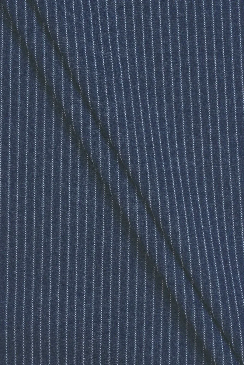 Włoski jeans w kolorze ciemnym niebieskim z białymi paskami co 0,8cm. Tkanina jest grubsza, elastyczna, z wplecioną białą niteczką, która tworzy pionowe paski. Jest ona wypukła i nadaje tkaninie delikatnej struktury. Jeans jest niezwykle wszechstronną tkaniną, świetnie sprawdzi na sukienki, spódniczki, spodnie lub cienkie katany.