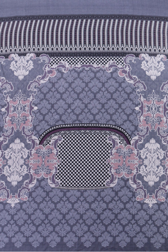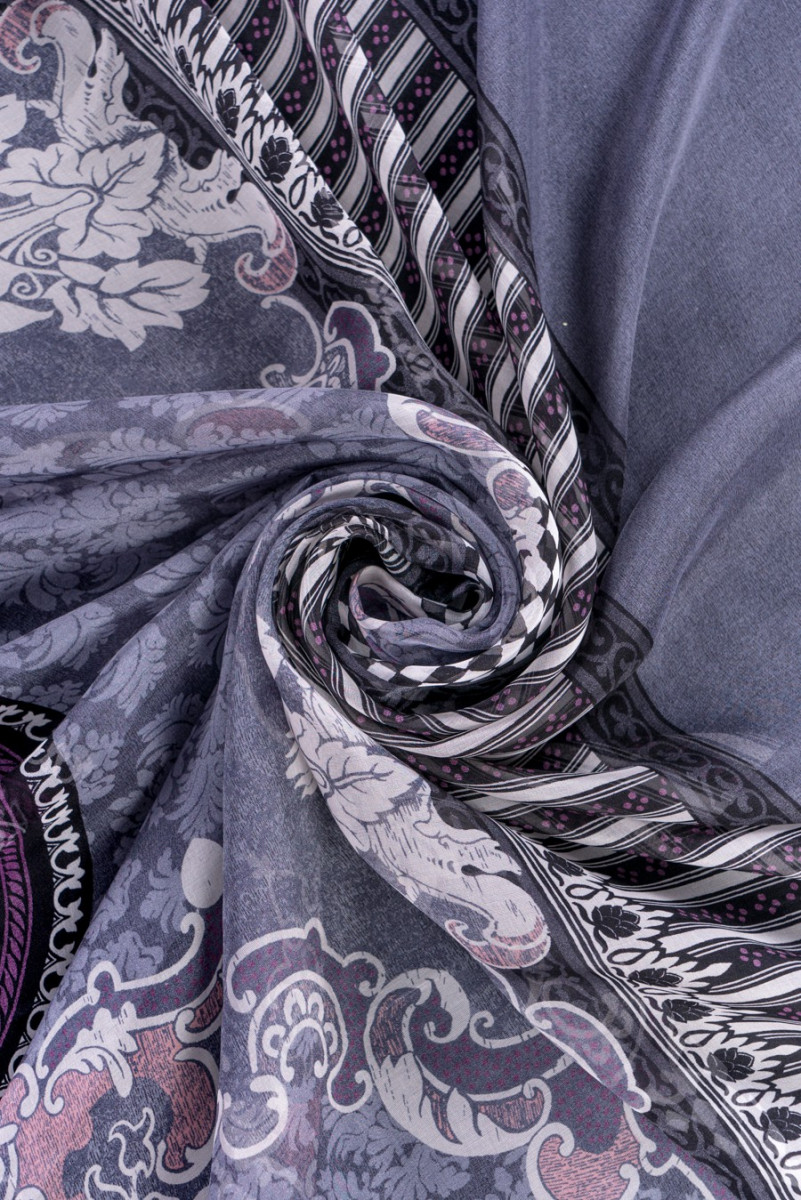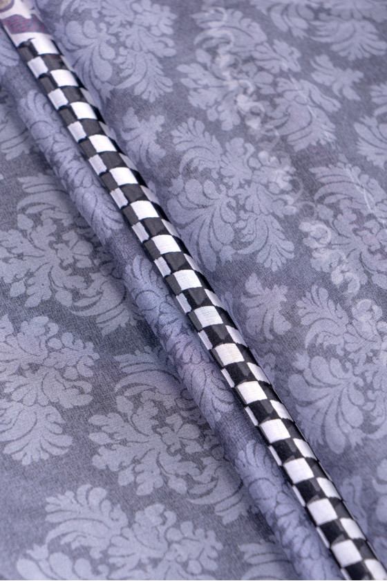 Włoski szyfon jedwabny w ciekawym kuponie 135*140 cm. Wzór zaczyna się ozdobnym pasem o szerokości 20 cm , dalej przechodzi we wzór ornamentowej mozaiki w kolorze szarym z elementami antycznego różu oraz biało-czarną szachownicą.