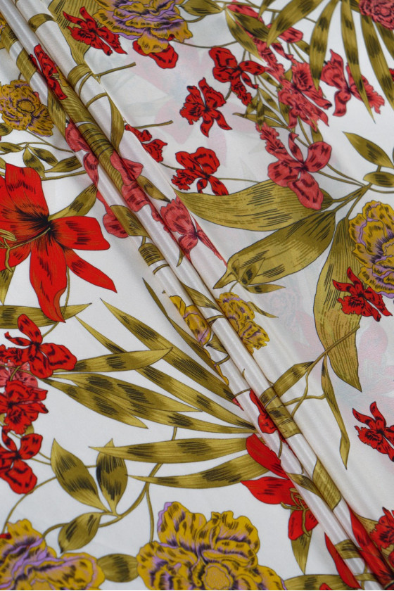 Włoska krepa jedwabna w czerwone oraz żółte kwiaty na szaro-zielonym tle, całości dopełniają liście w kolorze oliwkowym. Krepa jedwabna to tkanina delikatna, cienka, półmatowa. Można z niej wyczarować zwiewne sukienki, delikatne bluzeczki, chusty, szaliki.