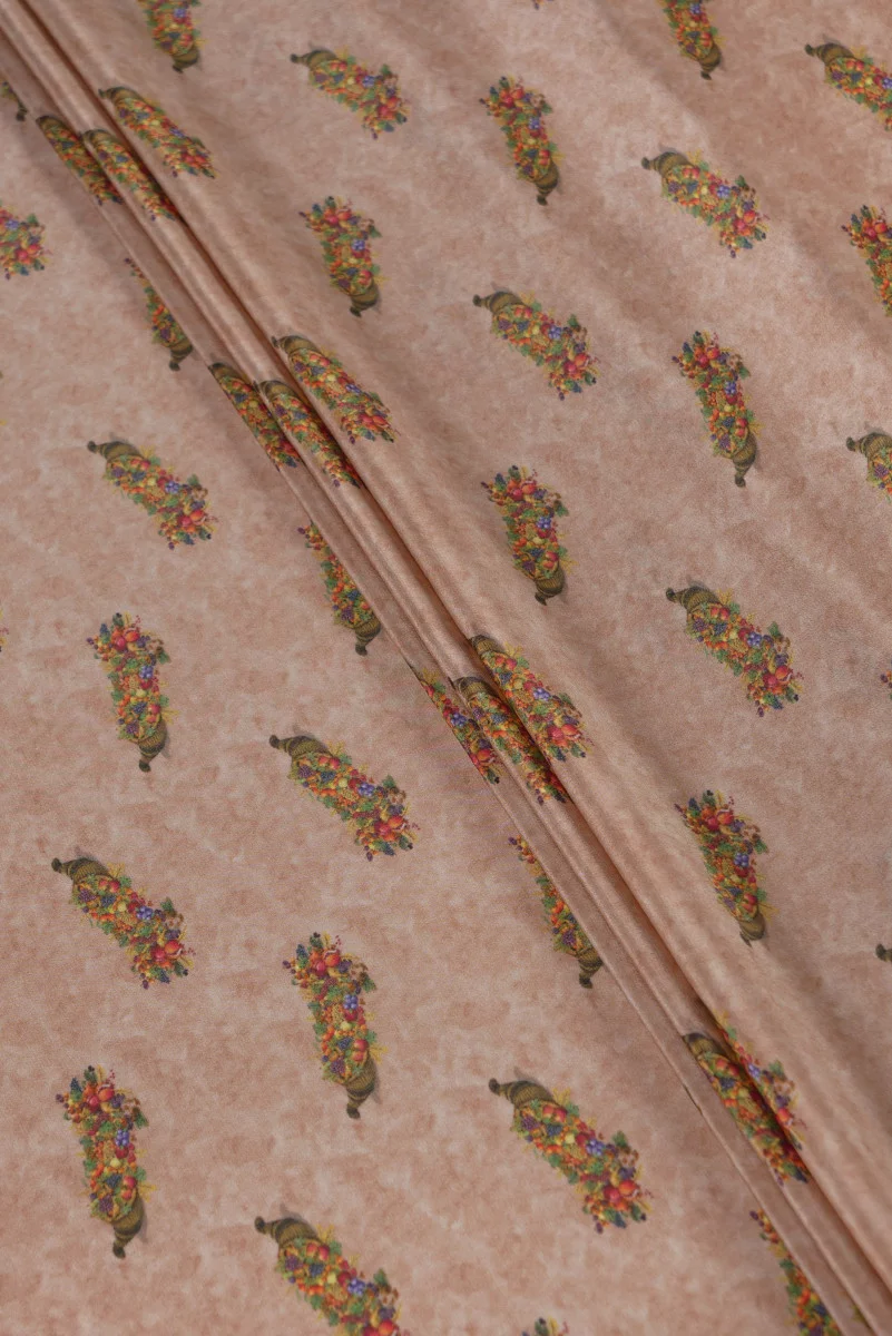Włoska krepa 100% jedwabna z motywem "Rogu obfitości" (6 cm) na beżowym tle. Krepa jedwabna to tkanina delikatna, cienka, półmatowa.