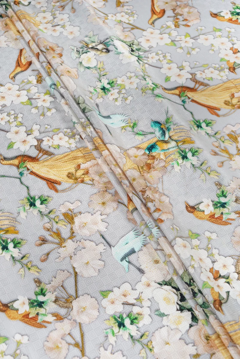 Piękną, włoska tkanina 100% jedwabna w kolorze jasnej szarości z motywem kwiatów i ptaków. Tkanina o bardzo oryginalnym splocie żakardowym w formie matowo-błyszczącej kosteczki. Tkanina nieelastyczna, lekka, kryjąca z delikatnym połyskiem - idealna do uszycia eleganckiej sukni, bluzki, spódnicy lub szala.