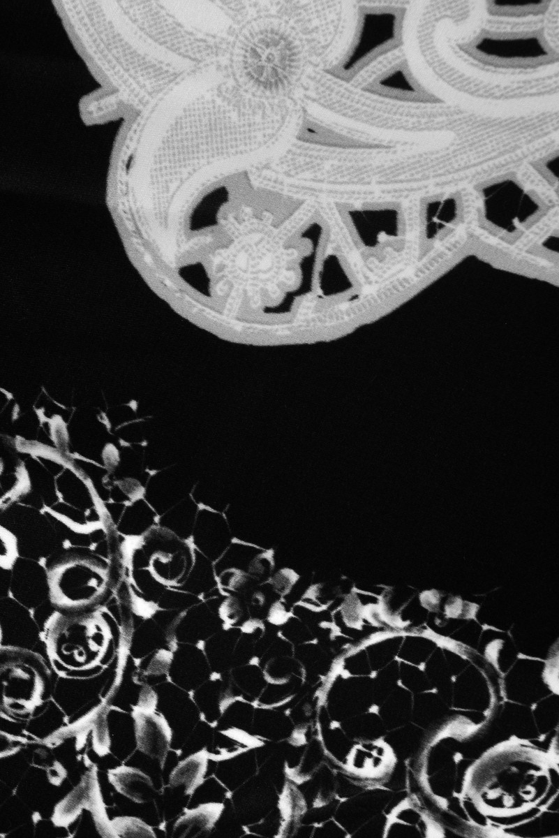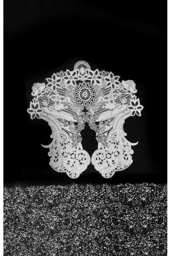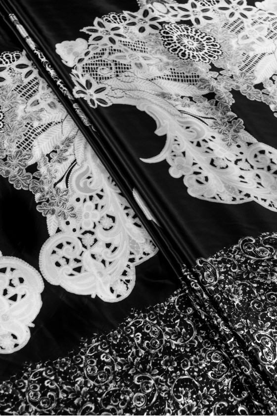 Włoska satyna 100% jedwabna w kolorze czarnym z dużym, szarym wzorem orientalnym o szerokości 56 cm. Z jednej strony wykończona jest ozdobnym borderem o szerokości 38 cm z motywem drobnych kwiatków i gałązek. Tkanina występuje w kuponie o wymiarach 80 cm* 135 cm i szyjemy ją obwodowo.