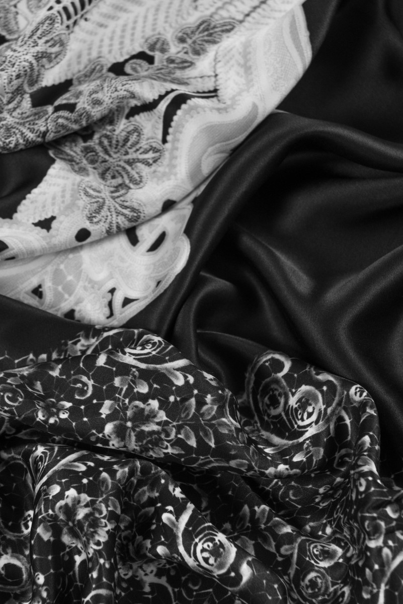 Włoska satyna 100% jedwabna w kolorze czarnym z dużym, szarym wzorem orientalnym o szerokości 56 cm. Z jednej strony wykończona jest ozdobnym borderem o szerokości 38 cm z motywem drobnych kwiatków i gałązek. Tkanina występuje w kuponie o wymiarach 80 cm* 135 cm i szyjemy ją obwodowo. Satyna jedwabna jest gęstą i lekką tkaniną o płaskiej powierzchni, wykonaną w splocie atłasowym. Dodatkowym jej atutem jest gładkość i trwałość, a także to, że bardzo dobrze się układa, nie prześwituje i jest przyjemna w dotyku. Z jednej strony jest matowa z drugiej zaś szlachetnie błyszcząca. Można z niej wyczarować zwiewne sukienki, delikatne bluzeczki, spódnice, chusty, szaliki.