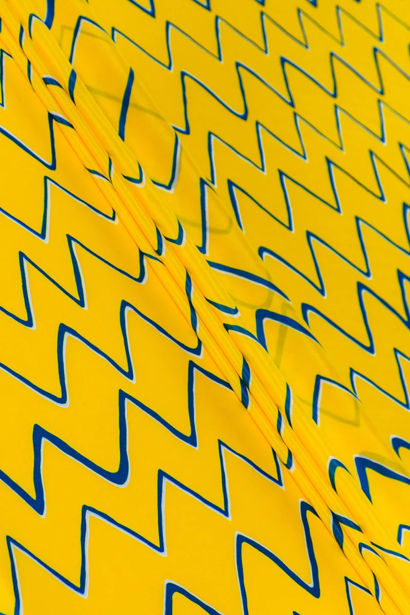 Włoska krepa 100% jedwabna w kolorze żółtym z motywem niebieskich zygzaków, ułożonych pionowo (po długości tkaniny). Krepa jedwabna to tkanina delikatna, cienka, półmatowa. Jest miękka w dotyku i bardzo dobrze się układa.