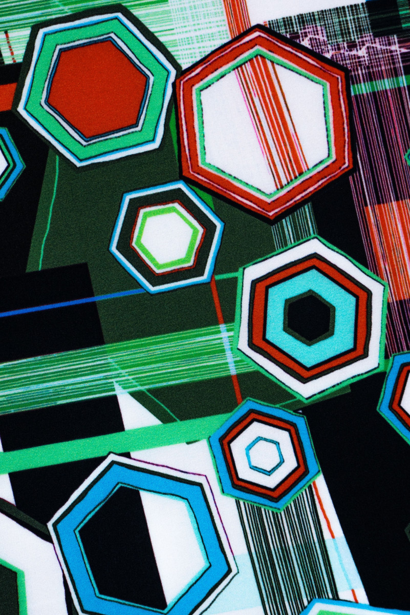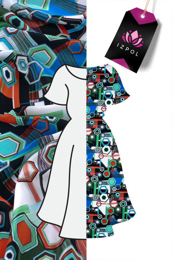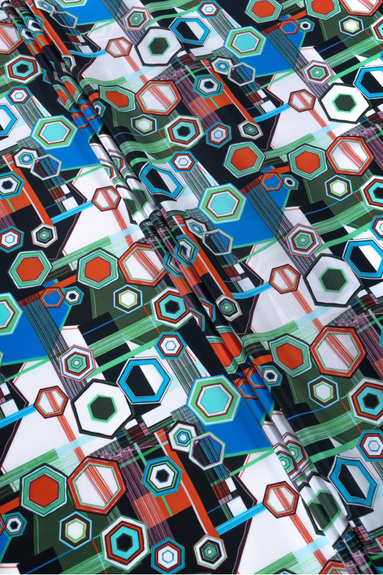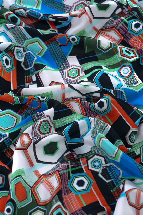 Włoska satyna 100% jedwabna w geometryczne wzory o wielkości 3 - 7 cm w kolorystyce zieleni, niebieskiego i pomarańczy - druk wykonany jest na matowej stronie. Satyna jedwabna jest gęstą i lekką tkaniną o płaskiej powierzchni, wykonaną w splocie atłasowym. Dodatkowym jej atutem jest gładkość i trwałość, a także to, że bardzo dobrze się układa, nie prześwituje i jest przyjemna w dotyku. Z jednej strony jest matowa z drugiej zaś szlachetnie błyszcząca. Można z niej wyczarować zwiewne sukienki, delikatne bluzeczki, spódnice, chusty, szaliki.
