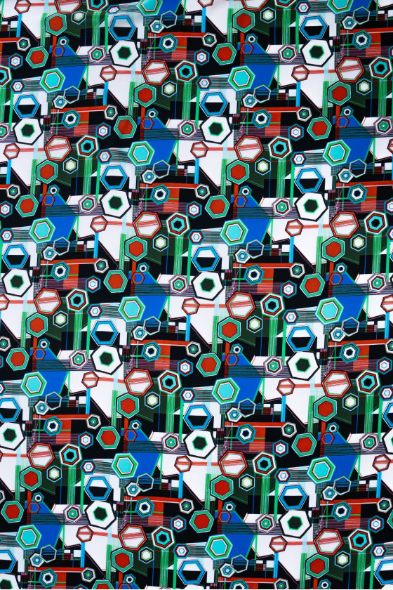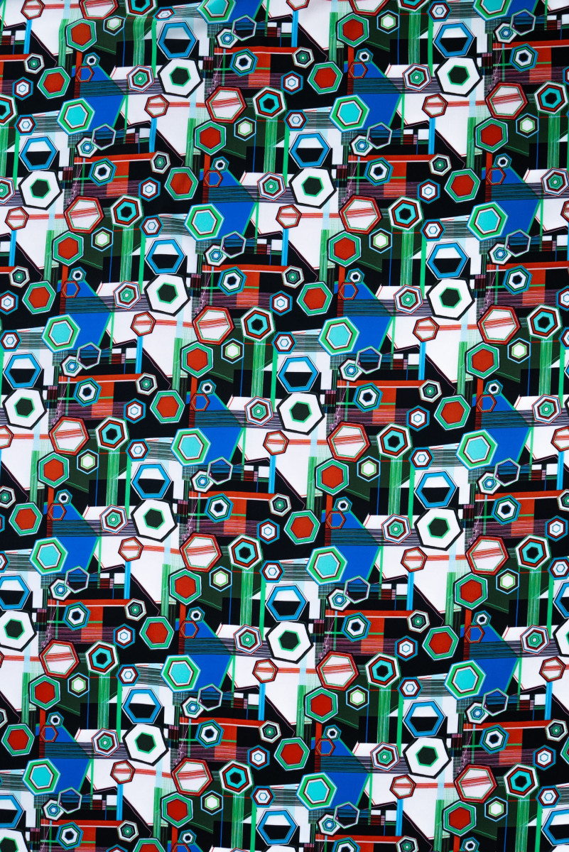 Włoska satyna 100% jedwabna w geometryczne wzory o wielkości 3 - 7 cm w kolorystyce zieleni, niebieskiego i pomarańczy - druk wykonany jest na matowej stronie.