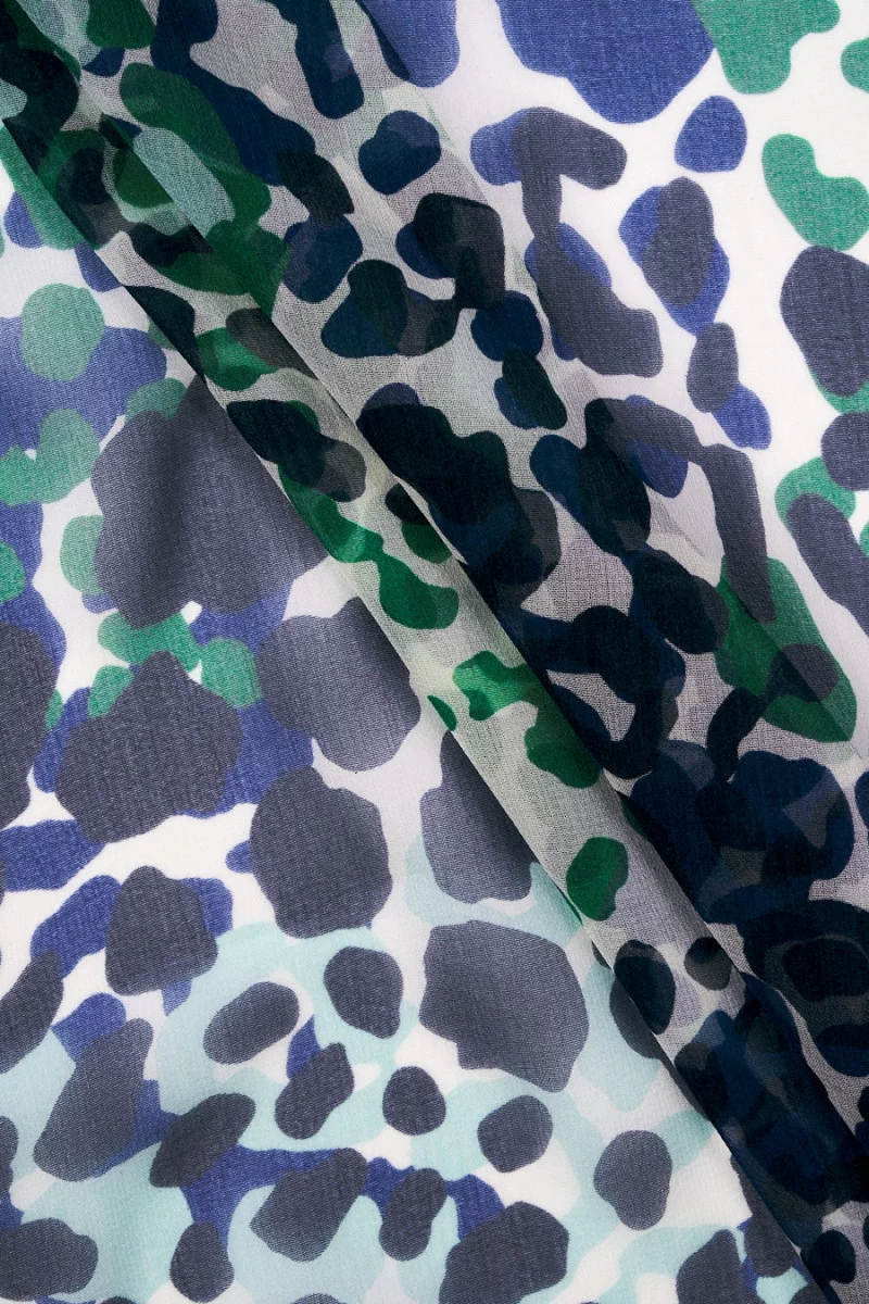 Włoski szyfon 100% jedwabny w kolorze szaro-zielonym z motywem chabrowo-granatowej panterki z zielonymi akcentami. Szyfon jedwabny to tkanina cienka, transparentna, matowa, lekka i zwiewna. Idealna do uszycia sukienki, bluzki, spódnicy lub szala.