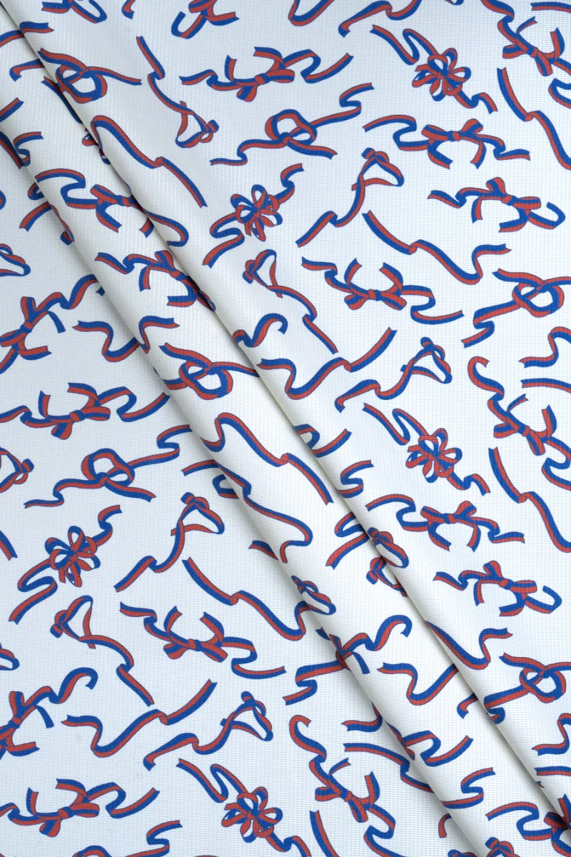 Włoska tkanina 100% jedwabna w kolorze śmietanowym z motywem wstążeczek. Tkanina jest delikatnie grubsza, ma drobną strukturę żakardową oraz charakterystyczny dla tkanin jedwabnych delikatny połysk. Wzór jest gęsty o nieregularnym kształcie w kolorze niebiesko- czerwonym, występuje w kolekcji znanego, włoskiego Domu Mody. Jest to fantastyczna propozycja do uszycia lekkiej bluzeczki lub sukienki. Jeśli lubisz szlachetne tkaniny oraz markowe wzory w modnych kolorach to jest to tkanina właśnie dla Ciebie.