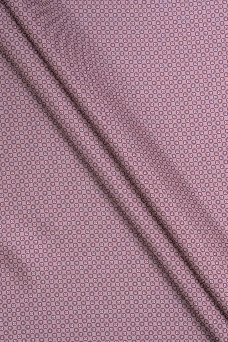 Włoska tkanina 100% jedwabna typu twill w kolorze brudnego różu z drobnym wzorem. Bardzo fajny, drobny wzór (0,4cm) w kolorze bordowym z łososiowym wypełnieniem. Kształtem przypominający groszki i jest bardzo gęsto rozmieszczony. Tkanina jest cienka ale kryjąca o delikatnie skośnym splocie, idealnie sprawdzi się do uszycia koszuli, sukienki lub apaszki. Fantastyczna propozycja dla fanów drobnych wzorów w stonowanych kolorach.