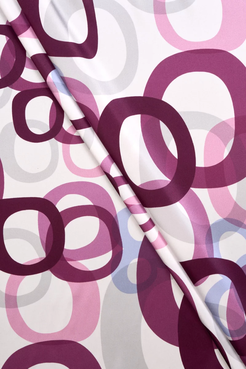 Włoska satyna jedwabna z dodatkiem elastanu z motywem nieregularnych kółek w kolorach buraczkowym, różowym i szarym na białym tle. Tkanina jest elastyczna, lejąca, delikatna w dotyku, miękka oraz kryjąca. Dodatek elastanu sprawia, że jest wygodniejsza w noszeniu i się mniej gniecie. Gęsto położone geometryczne wzory o różnych wielkościach, największe koło ma wymiar 19 cm * 20 cm, najmniejsze 6 cm * 6 cm. Ciekawa propozycja do stworzenia oryginalnej koszuli, sukienki lub spódnicy.