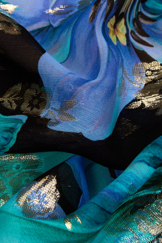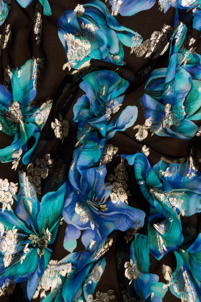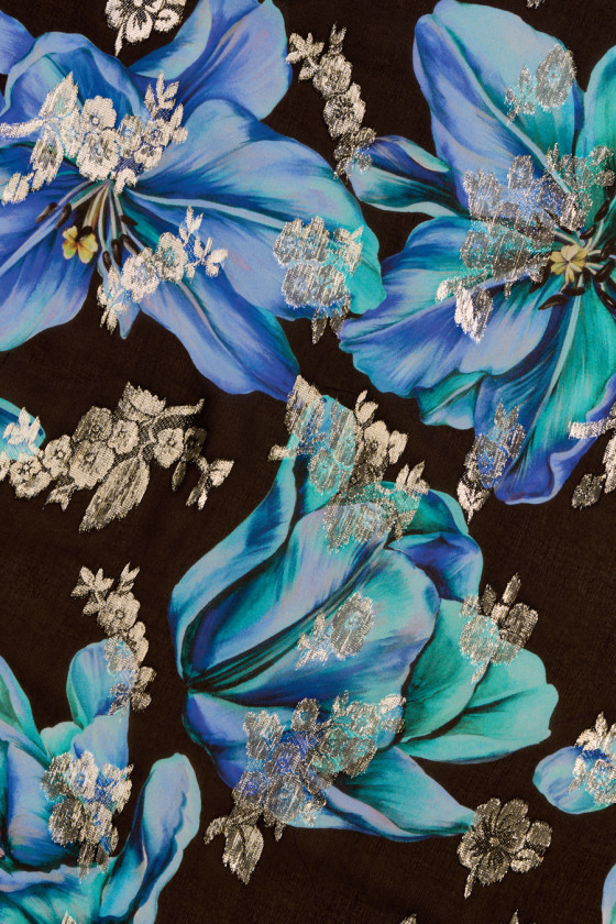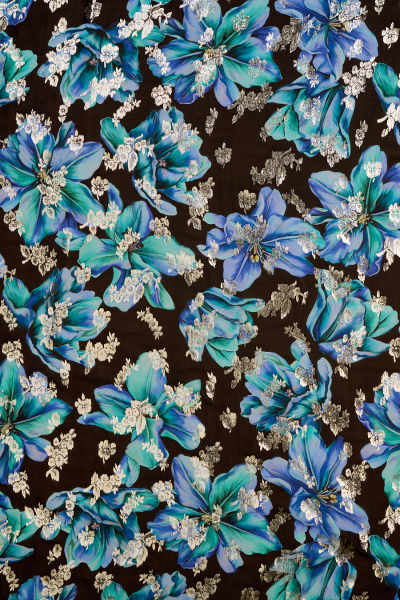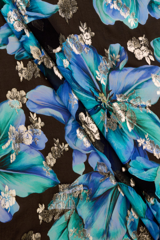 Włoski szyfon jedwabny w czarnym kolorze z gęstym wzorem dużych kwiatów w odcieniach turkusu i niebieskiego, zdobiony drobnymi, metalicznymi kwiatkami. Tkanina jest zwiewna, lekka, delikatna w dotyku, transparentna i pięknie się układa. Niezwykłe połączenia kolorystyczne oraz błyszczące na złoto i srebro elementy nadają tkaninie wyjątkowego wyglądu, idealna propozycja do stworzenia niepowtarzalnej sukienki, spódnicy lub bluzki.