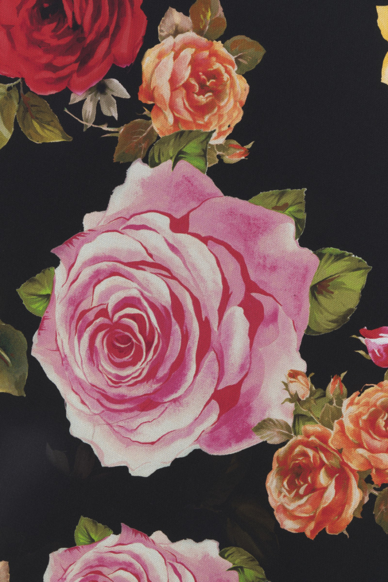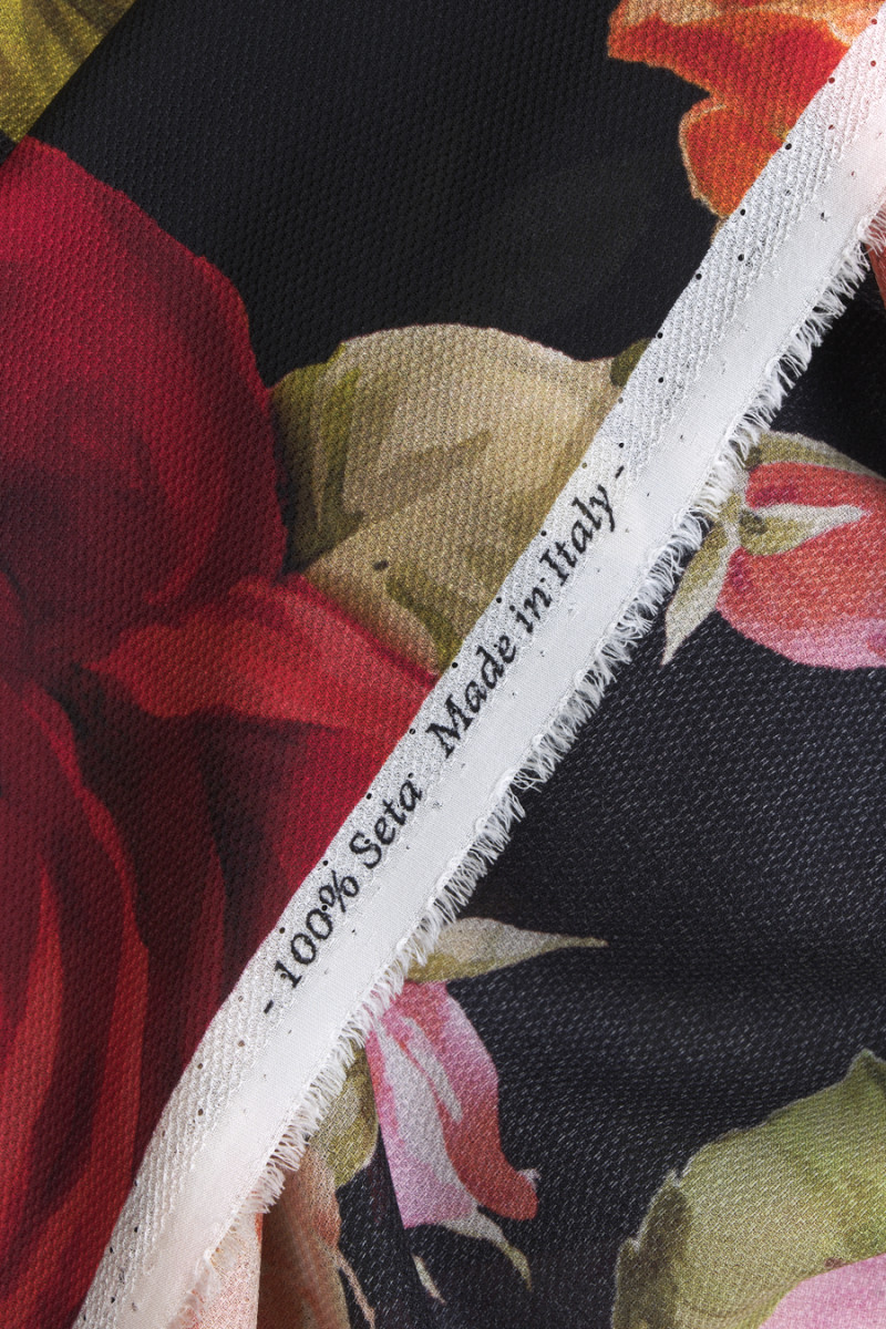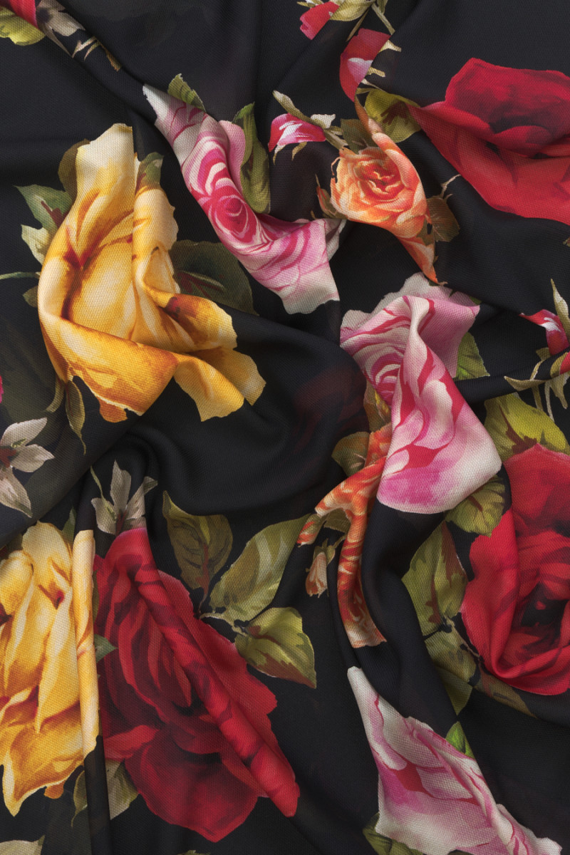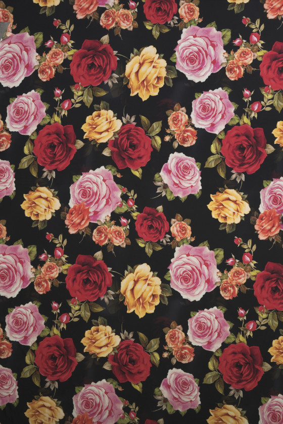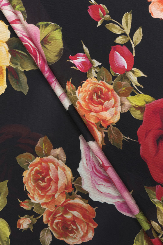 Włoska tkanina 100% jedwabna w czarnym kolorze, z gęstym wzorem dużych róż w kolorze czerwonym, pomarańczowym, różowym i żółtym. Tkanina o ciekawym splocie przypominającym siatkę, wykończona subtelnym połyskiem. Jest lekka, zwiewna, transparentna i pięknie się układa. Kolorowe kwiaty o wielkościach od 9 cm do 24 cm. Piękna propozycja z której można wyczarować sukienki, spódniczki lub bluzki.