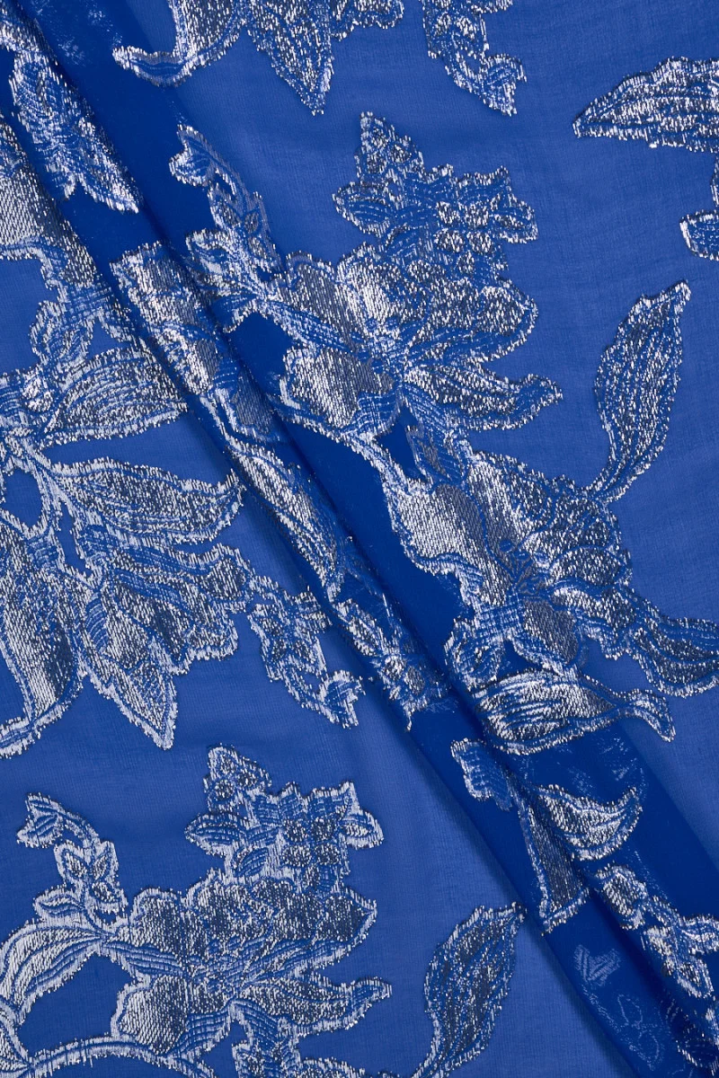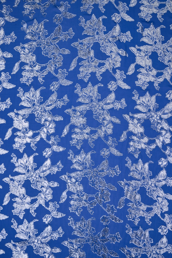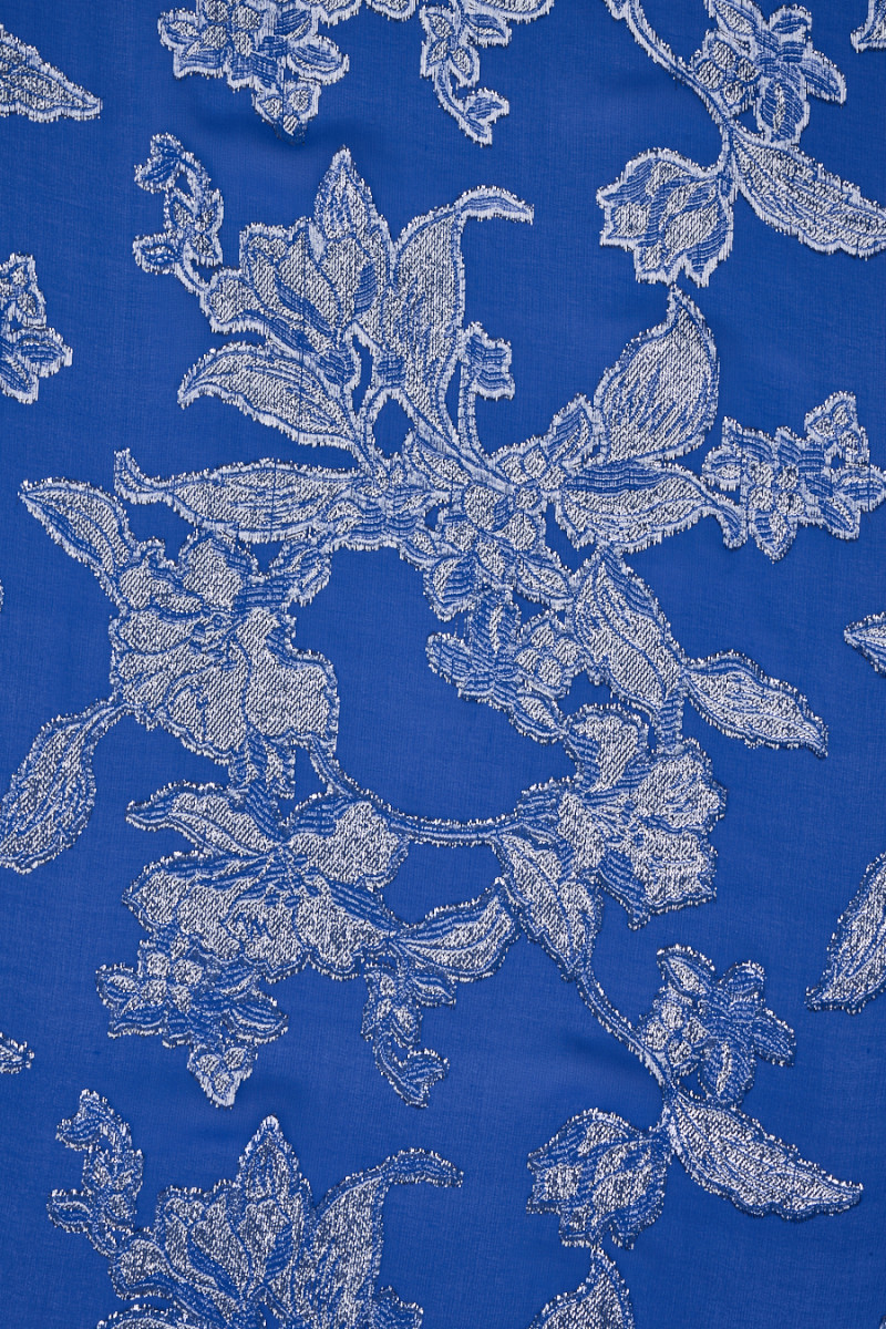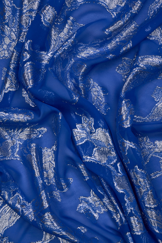 Włoska tkanina jedwabna w kolorze chabrowym z wyszywanymi kwiatami ze srebrnej, błyszczącej nitki. Tkanina o splocie żorżetowym, cienka, transparentna, bardzo lekka, nieelastyczna. Przepiękna propozycja z której można stworzyć wyjątkową, zwiewną sukienkę a także bluzkę, spódnicę czy tunikę.