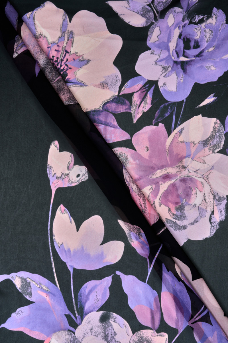 Włoski szyfon 100% jedwabny z motywem dużych, fioletowych kwiatów na czarnym tle. Tkanina występuje w kuponach o wymiarach 140 cm * 135 cm. Materiał jest lekki, zwiewny, transparentny, nieelastyczny i matowy. Romantyczna propozycja idealna na zwiewne sukienki, spódnice a także bluzki i chusty.