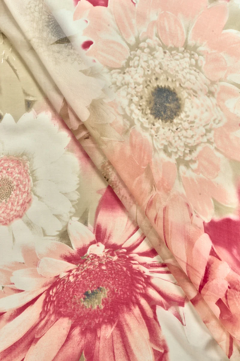 Włoski szyfon 100% jedwabny z motywem bardzo dużych, pastelowych kwiatów. Romantyczny wzór o długościach od 22 do 35 cm w kolorach beżu, jasnej maliny, jasnego różu i śmietany. Tkanina jest transparentna, bardzo lekka, zwiewna, nieelastyczna i delikatnie sztywna w chwycie. Wspaniała propozycja na sukienki, spódnice, bluzki a także szale.