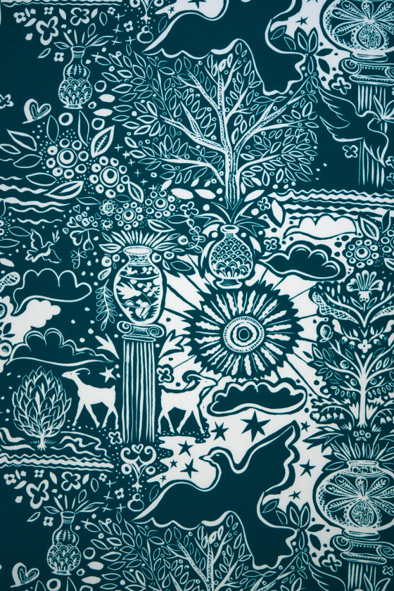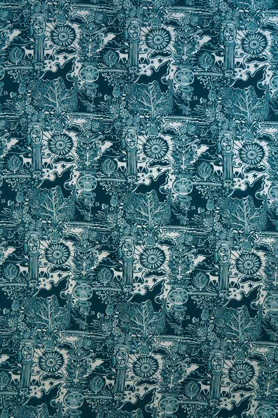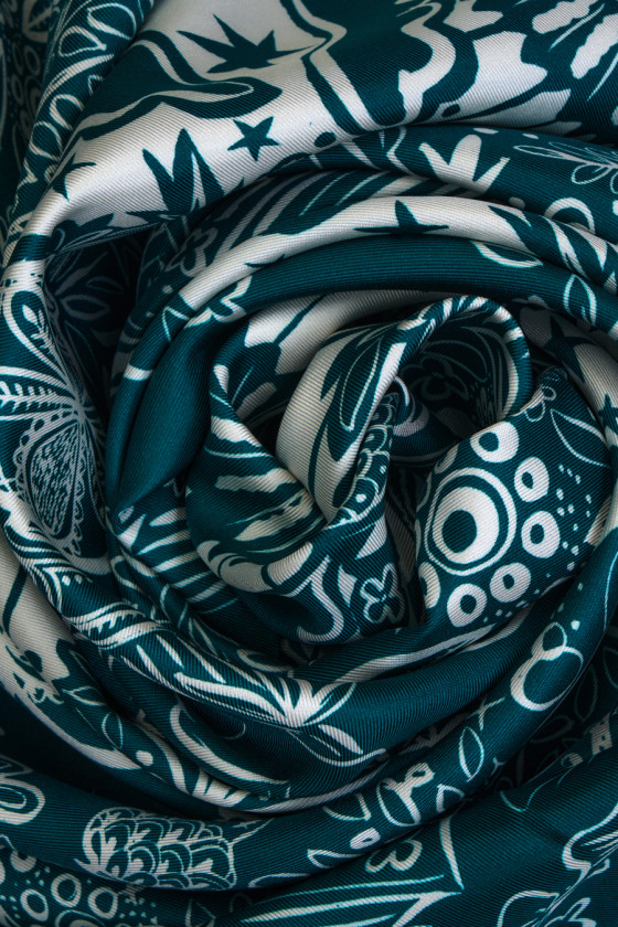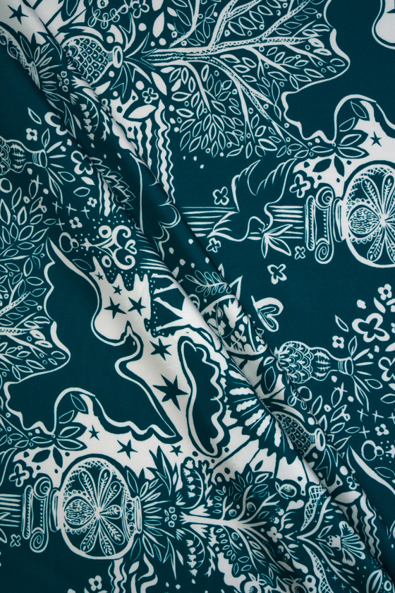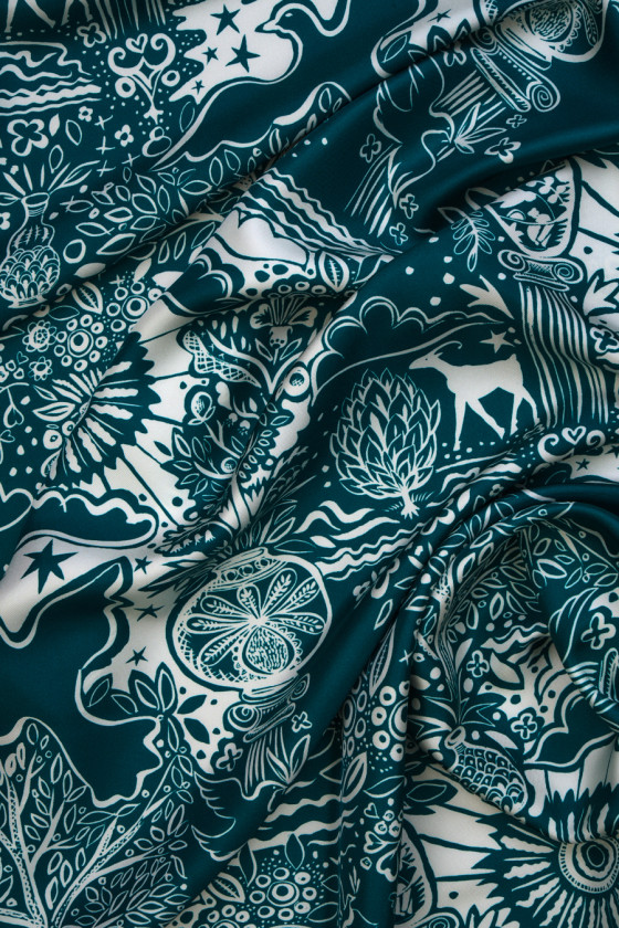 Włoska tkanina 100% jedwabna z starożytnymi motywami na morsko zielonym tle. Gęste wzory w kolorze śmietanowym przedstawiają drzewa oliwne, wazony, gołębie, kozy oraz słońca. Tkanina jest lejąca, miękka, nieelastyczna, ma delikatny diagonalny splot oraz pochodzi z kolekcji znanego projektanta mody. Interesująca propozycja, która sprawdzi się na zwiewne sukienki, spódnice, a także bluzki i koszule.