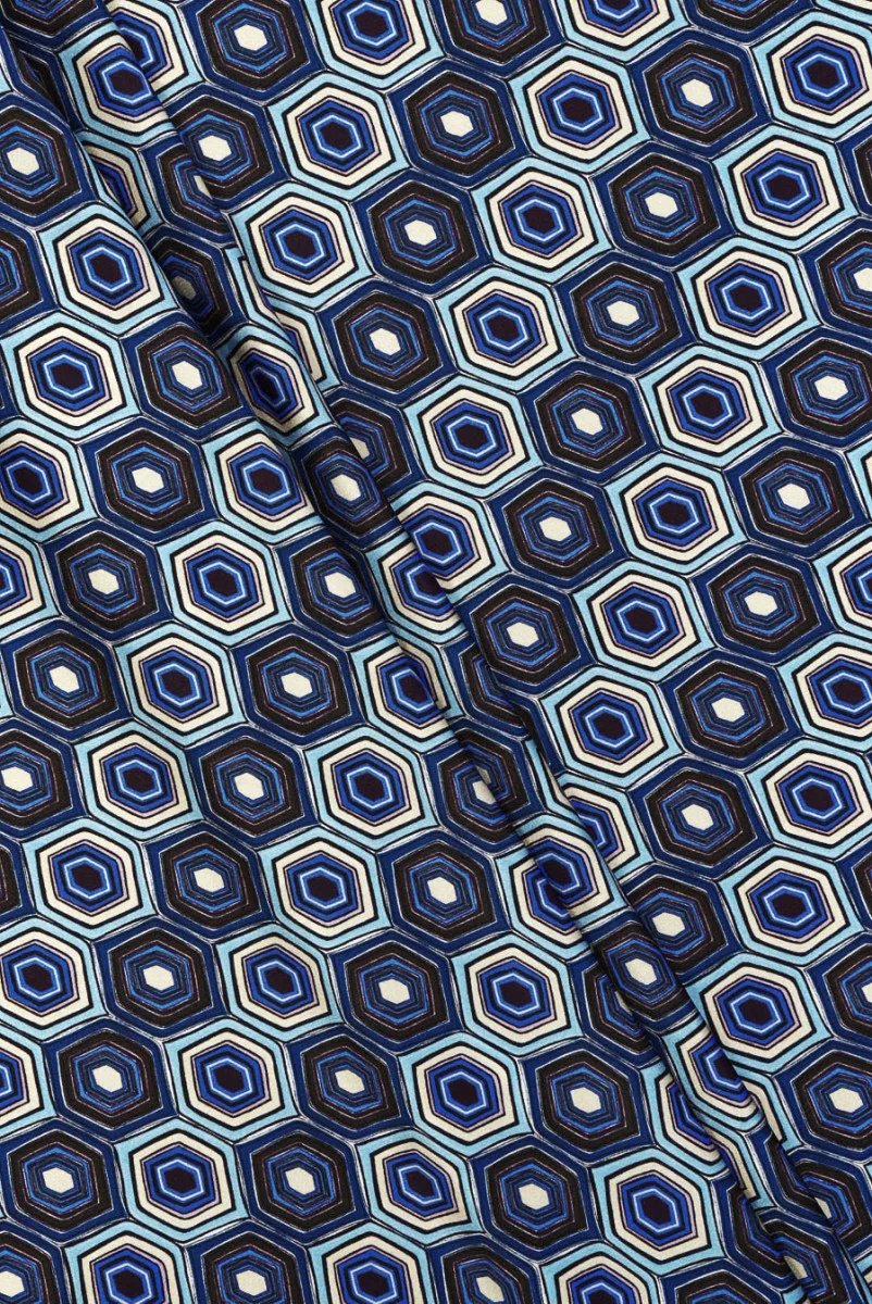 Włoska satyna jedwabna z dodatkiem elastanu, z graficznym motywem składającym się z heksagonów położonych jeden przy drugim. Całość wzoru wykonana jest w kolorze niebieskim, beżowym, chabrowym oraz ciemno brązowym. Jeden element ma wielkość 3,5 cm * 4,5 cm. Materiał jest lejący, elastyczny, kryjący, miękki oraz wykończony pięknym połyskiem. Interesująca propozycja, która doskonale sprawdzi się na koszule, bluzki, tuniki a nawet luźniejsze spodnie.