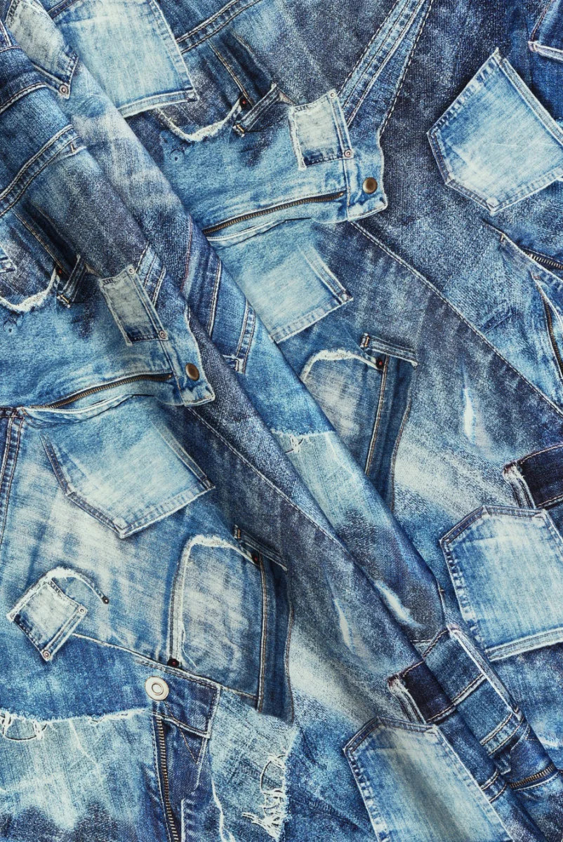 Włoska satyna 100% jedwabna z motywem spodni jeansowych w niebieskich odcieniach. Gęsty wzór przedstawiający elementy spodni takich jak zamki, kieszenie guziki, przetarcia w materiale, wystrzępienia. Tkanina jest lejąca, kryjąca, nieelastyczna, lekka i wykończona eleganckim połyskiem. Bardzo oryginalna propozycja, z której można stworzyć bluzki, koszule, sukienki a także luźniejsze spodnie.