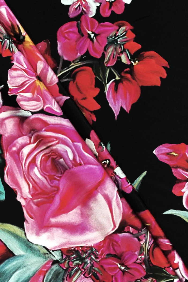 Włoska satyna jedwabna z dodatkiem elastanu z motywem dużych kwiatów w odcieniach czerwieni malinowej i ciemnego różu na czarnym tle. Kwiatowy wzór gęsto położony wzdłuż jednego brzegu i rzadziej na środku oraz drugim brzegu - zalecamy szycie obwodowe. Pojedynczy kwiat ma wielkość 15 cm * 15 cm. Tkanina jest elastyczna, lejąca, delikatna w dotyku, miękka oraz kryjąca. Wyjątkowa tkanina z której można wyczarować sukienki na różne uroczystości, a także eleganckie spódnice, bluzki czy tuniki.