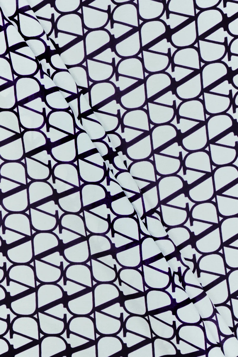 Włoska satyna jedwabna z dodatkiem elastanu z motywem ciemno fioletowych literek V ułożonych w rzędach na białym tle. Regularny, gęsty wzór drukowany na lewej, matowej stronie tkaniny, jedna litera ma wysokość 3 cm i umieszczona jest w niepełnym owalu. Tkanina jest lekka, lejąca, elastyczna, cienka i dość kryjąca. Interesująca propozycja z której można stworzyć oryginalne koszule bluzki, a także sukienki i spódnice, do których zalecamy użycie podszewki.