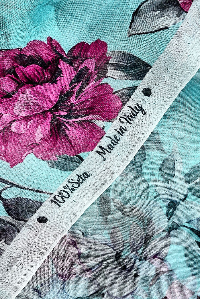 Włoski muślin 100% jedwabny z motywem kwiatów w kolorze fuksjowym, różowym oraz jasno szarym na jasno turkusowym tle. Pojedyncze, większe kwiaty mają wielkość od 8 cm do 11 cm, mniejsze około 3 cm, całość wzbogacona jest niewielkimi motywami liści i gałązek w kolorze popielatym, przechodzącym w niektórych miejscach w zgaszoną zieleń. Tkanina jest bardzo lekka, zwiewna, transparentna oraz nieelastyczna. Romantyczna tkanina w pięknych, intensywnych kolorach idealna letnie sukienki i spódnice. Doskonale sprawdzi się także na wyjściowe kreacje typu wesela czy rodzinne spotkania.