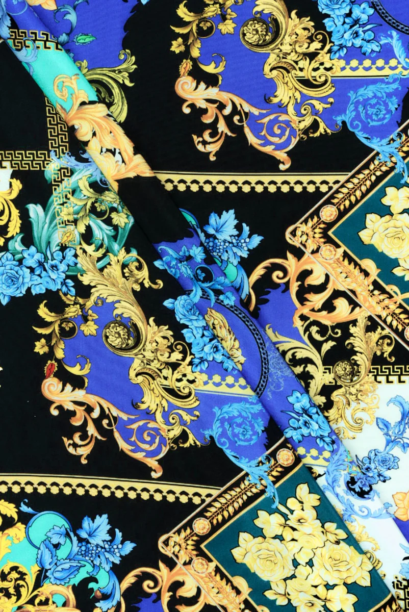 Włoska krepa 100% jedwabna z motywem żółtych i niebieskich, gęsto położonych ornamentów średniej wielkości. Charakterystyczne wzornictwo inspirowane znanym domem mody zawiera w sobie złote ramki, złotą twarz, roślinność a wszystko położone jest na tle w kolorze czarnym, chabrowym i jasnym turkusowym. Tkanina jest lekka, zwiewna, cienka, nieelastyczna i miękka. Wspaniała propozycja dla osób lubiących sygnowane materiały. Tkanina sprawdzi się w uszyciu bluzek, koszul, sukienek i spódnic.
