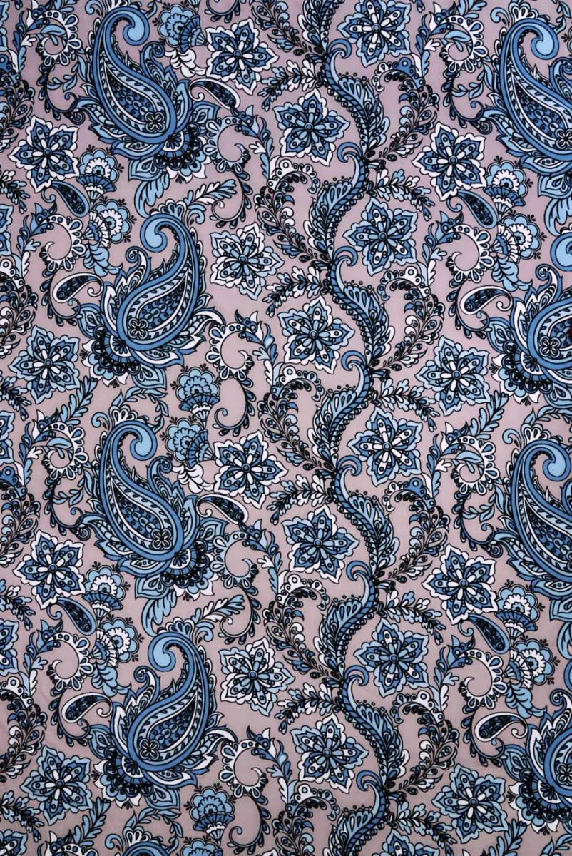 Włoska krepa 100% jedwabna z motywem dużych kwiatów oraz wzorów paisley na tle w kolorze brudnego różu. Regularnie położone pojedyncze elementy mają wysokość od 18cm (kwiat) do 44 cm (największy paisley). Orientalne motywy zrobione w dwóch odcieniach koloru niebieskiego oraz śmietanie, są gęsto położone i stykają się ze sobą w niektórych miejscach. Tkanina jest cienka, lekka, zwiewna, miękka i nieelastyczna. Wyjątkowa propozycja dla osób lubiących zdecydowane wzornictwo w spokojniejszych kolorach. Idealna na letnie sukienki, spódnice, bluzki i koszule.