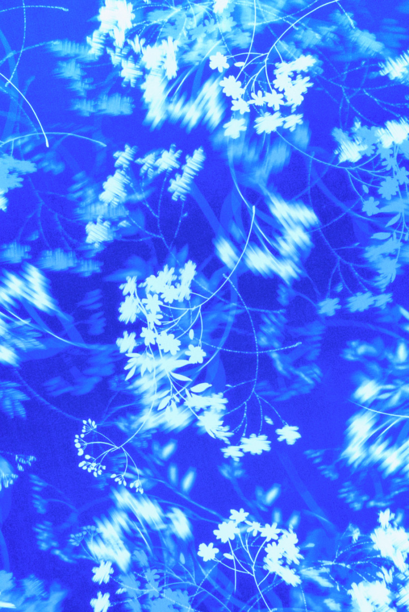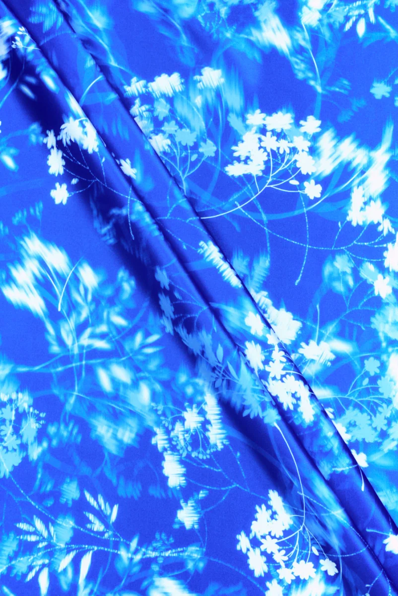 Włoska satyna 100% jedwabna z motywem białych, przeważnie rozmytych kwiatków na gałązkach. Wzór jest dość gęsty, ale delikatny a całość położona jest na kontrastującym, chabrowym tle. Tkanina jest lejąca, zwiewna, kryjąca, nieelastyczna oraz wykończona pięknym połyskiem. Wyjątkowa propozycja z przeznaczeniem na sukienki, spódnice, bluzki, koszule a nawet lejące spodnie.