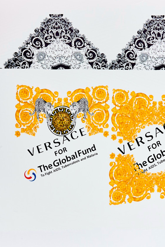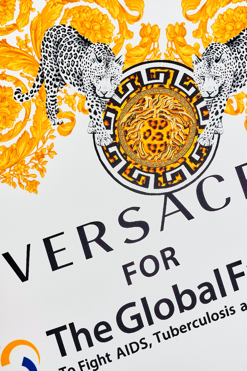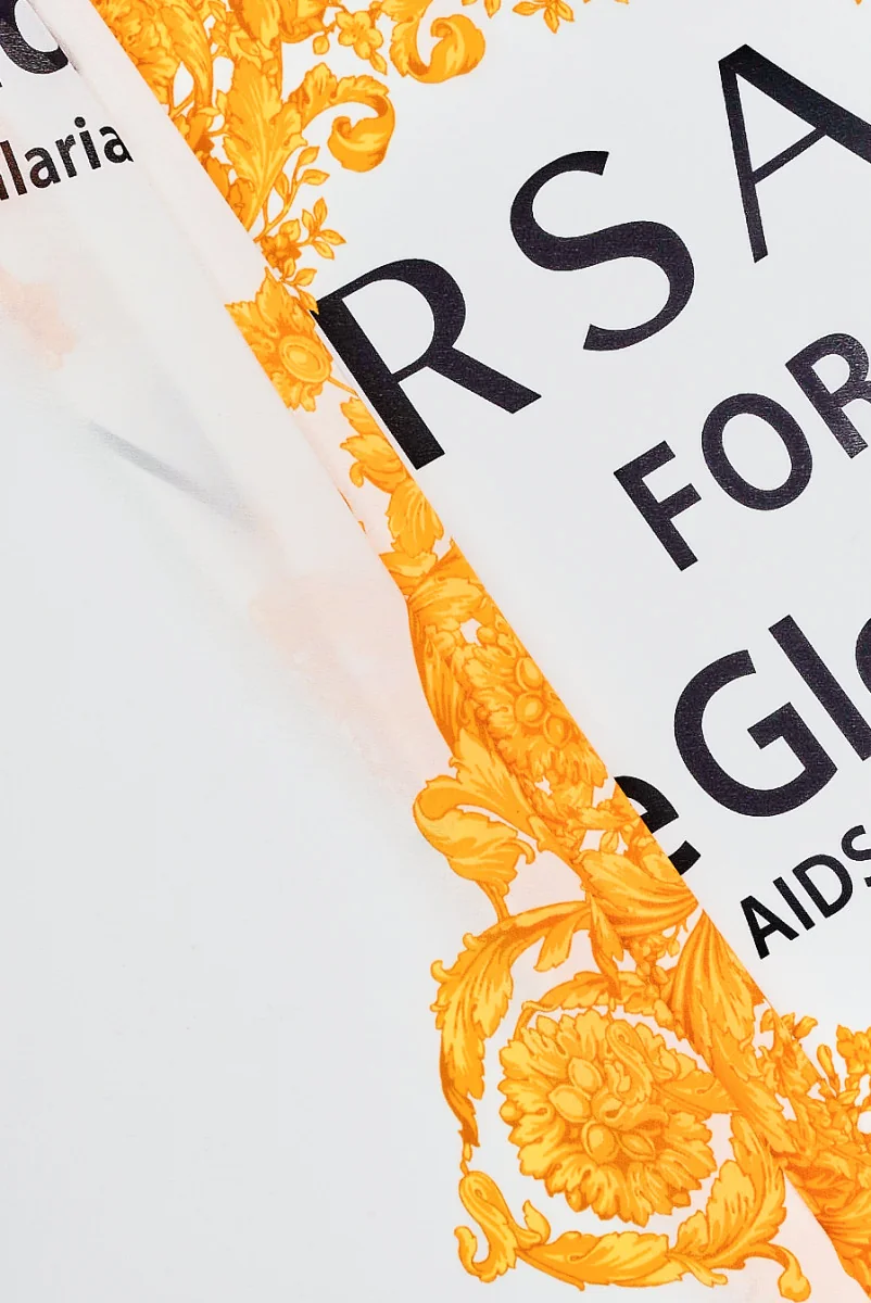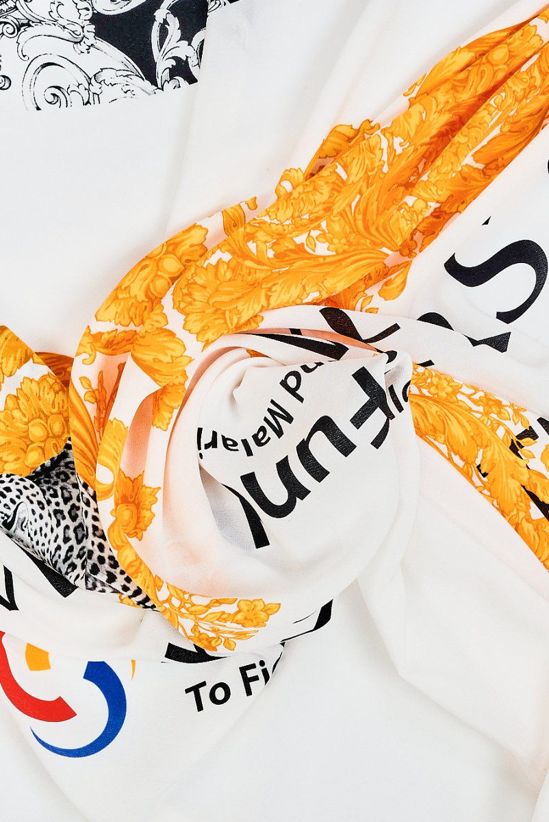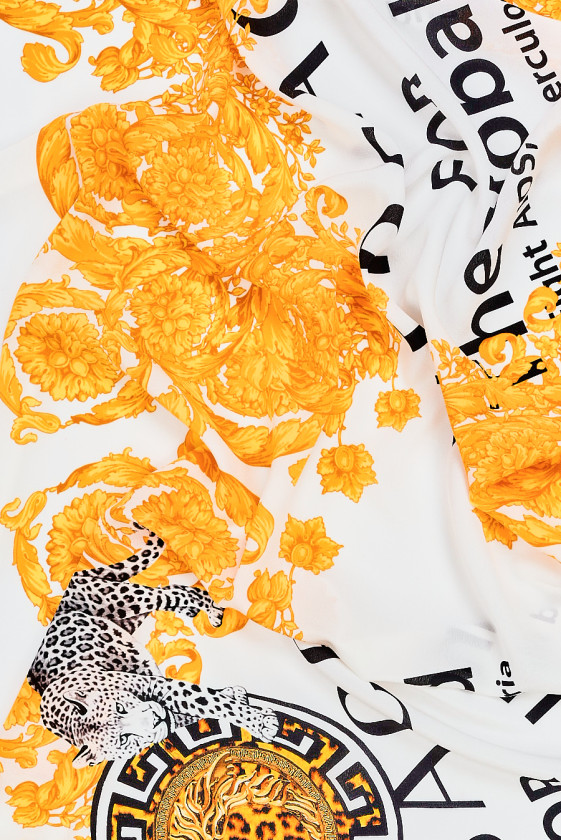 Włoska krepa 100% jedwabna z motywem czarnych napisów, dużych, złotych ornamentów oraz szarych panter na tle w kolorze śmietankowym. Tkanina występuje w kuponach o długości 130 cm i szerokości 135 cm. Pochodzi z kolekcji znanego projektanta mody. Materiał jest bardzo lekki, zwiewny, lekko transparentny oraz nieelastyczny. Doskonale sprawdzi się na bluzki, koszule czy chusty.