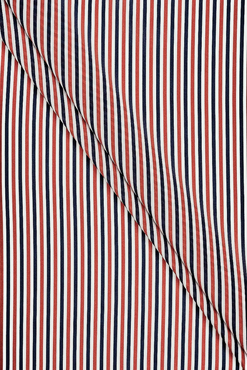 Włoska krepa 100% jedwabna z motywem wąskich pasków położonych wzdłuż szerokości tkaniny. Paski wykonane w kolorze granatu oraz ceglanej czerwieni na śmietankowym tle, które również tworzy pasek. Kolorowe motywy mają szerokość 4 mm, a śmietankowy 3 mm. Tkanina jest cienka, lekka, zwiewna, miękka i nieelastyczna. Doskonale sprawdzi się w uszyciu bluzki, koszuli, sukienki i spódnicy.