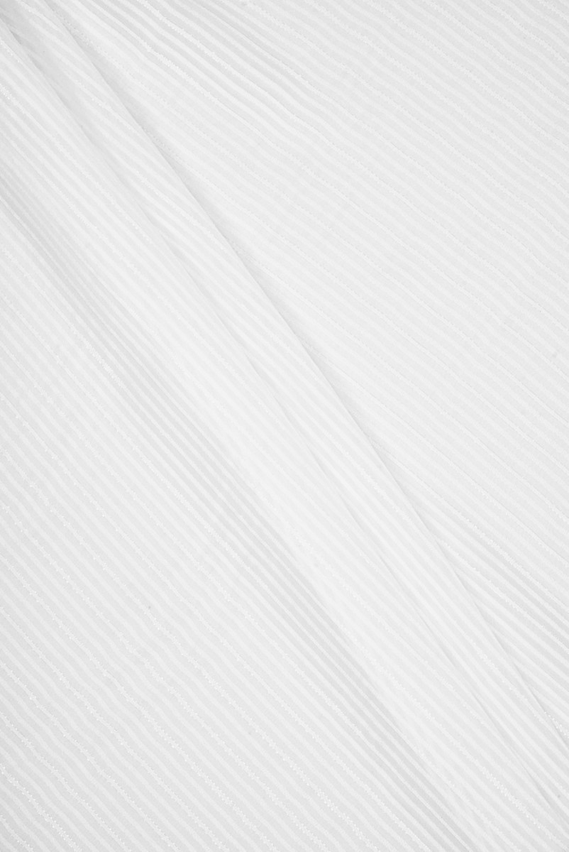 Włoska tkanina jedwabna typu devore z motywem wąskich paseczków, ułożonych pionowo w kolorze białym. Paski szyfonowe mają szerokość 0,3 cm a satynowe 0,2cm, dodatkowo tkanina ozdobiona jest srebrną, błyszczącą nitką lureksową. Tkanina jest cienka, lekko transparentna, lejąca, lekka i nieelastyczna. Doskonale sprawdzi się w uszyciu sukienki, bluzki, koszuli czy spódniczki.
