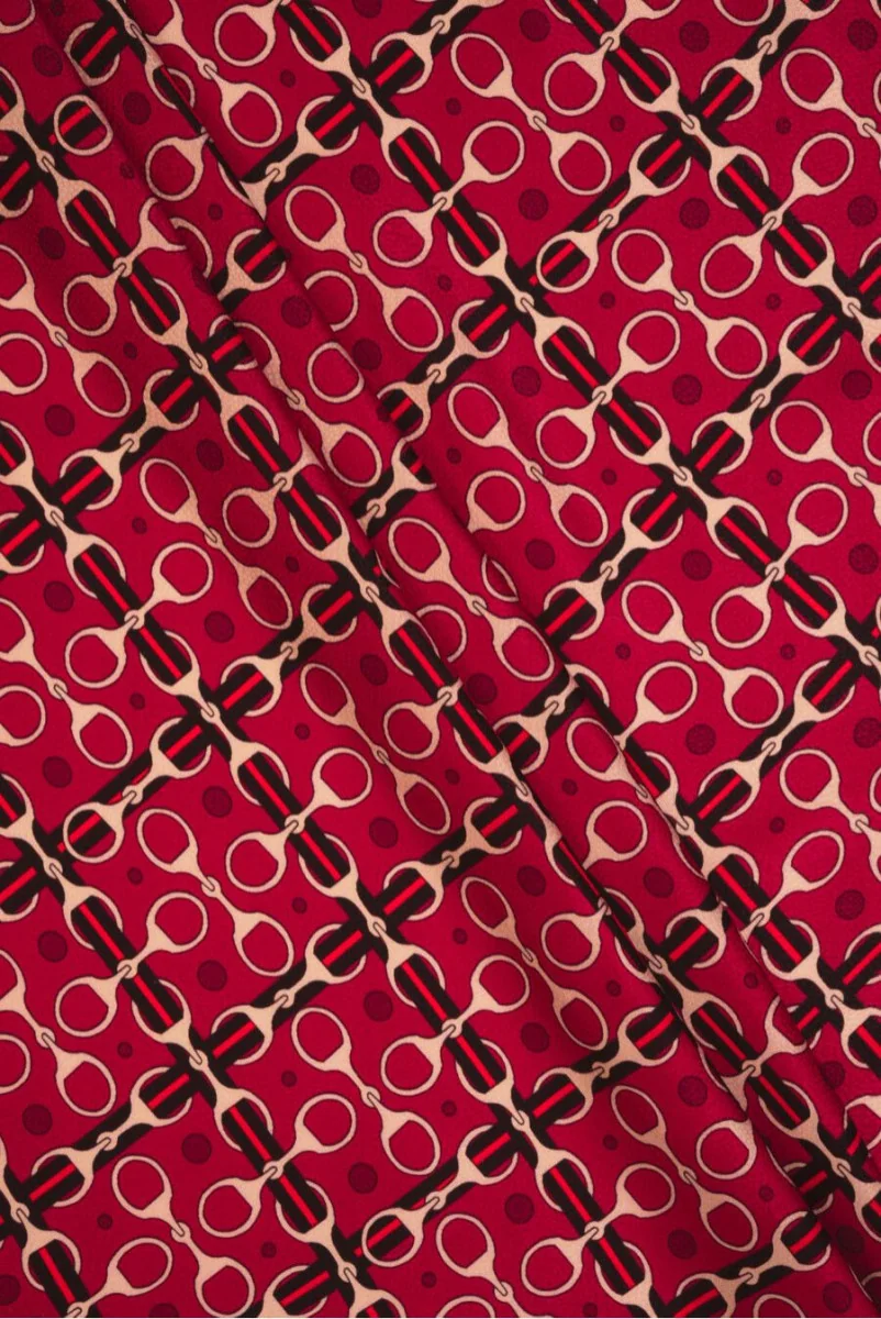 Włoska tkanina jedwabna z domieszką wiskozy o żakardowym splocie w kolorze ciemnej czerwieni. Regularny wzór przedstawiający sprzączki z przeplecionym czarno-czerwonym paskiem, który tworzy skośną kratę o szerokości 10cm. Tkanina jest lejąca, nieelastyczna, cienka, ale kryjąca oraz bardzo przyjemna w chwycie. Doskonale sprawdzi się w uszyciu bluzki, koszuli, sukienki i spódnicy.