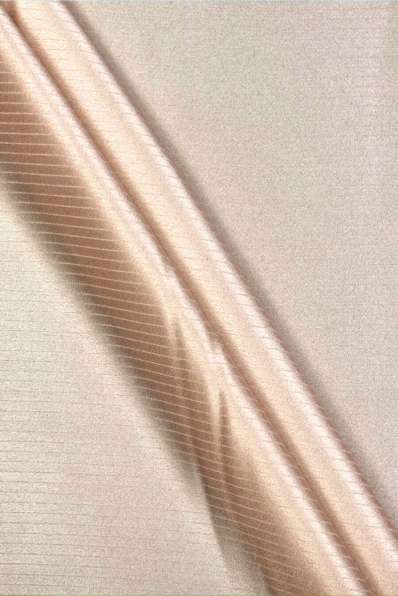 Włoska satyna 100% jedwabna w kolorze beżowym z motywem pasków. Wzór ułożony jest pionowo co 0,5cm i ma strukturę żakardową. Tkanina jest cienka, kryjąca, lekka, zwiewna i nieelastyczna. Interesująca propozycja dla fanów tkanin w najlepszej jakości. Świetnie sprawdzi się na sukienki, bluzki, koszule czy kimona.