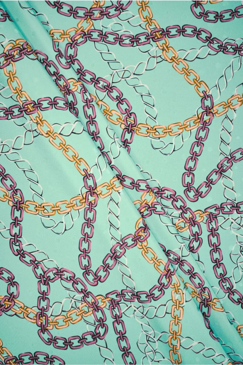 Włoska tkanina 100% jedwabna o żakardowym splocie z motywem łańcuchów na tle w kolorze szałwii. Gęsty wzór przedstawia trzy rodzaje łańcuchów. które przeplatają się wzajemnie i są wykonane w kolorze złotym, śmietankowym i ciemno brudnym różowym. Druk wykonany jest na matowej stronie, żakardowy wzór małych groszków ma elegancki połysk. Tkanina jest lejąca, nieelastyczna, cienka, ale kryjąca oraz bardzo przyjemna w chwycie. Doskonale sprawdzi się w uszyciu bluzki, koszuli, sukienki i spódnicy.