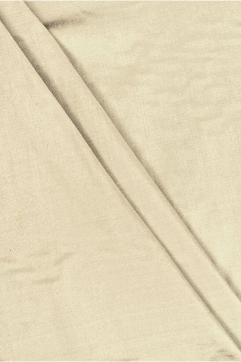 Włoska tkanina 100% jedwabna typu szantung w kolorze szampańskiego beżu. Tkanina gładsza z delikatnymi zgrubieniami. Jest kryjąca, nieelastyczna, układa się raczej sztywno i jest bardzo elegancka. Doskonale sprawdzi się na wieczorowe suknie, spódnice, bluzki a także żakiety.