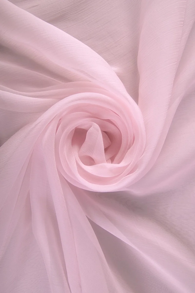 Włoski szyfon 100% jedwabny w kolorze jasnego różu. Tkanina ma bardzo oryginalną, drobno gniecioną strukturę. Jest delikatna, przeźroczysta i lekko elastyczna na włóknach. Idealnie sprawdzi się do uszycia lekkich i zwiewnych ubrań typu sukienka, spódnica lub bluzka.