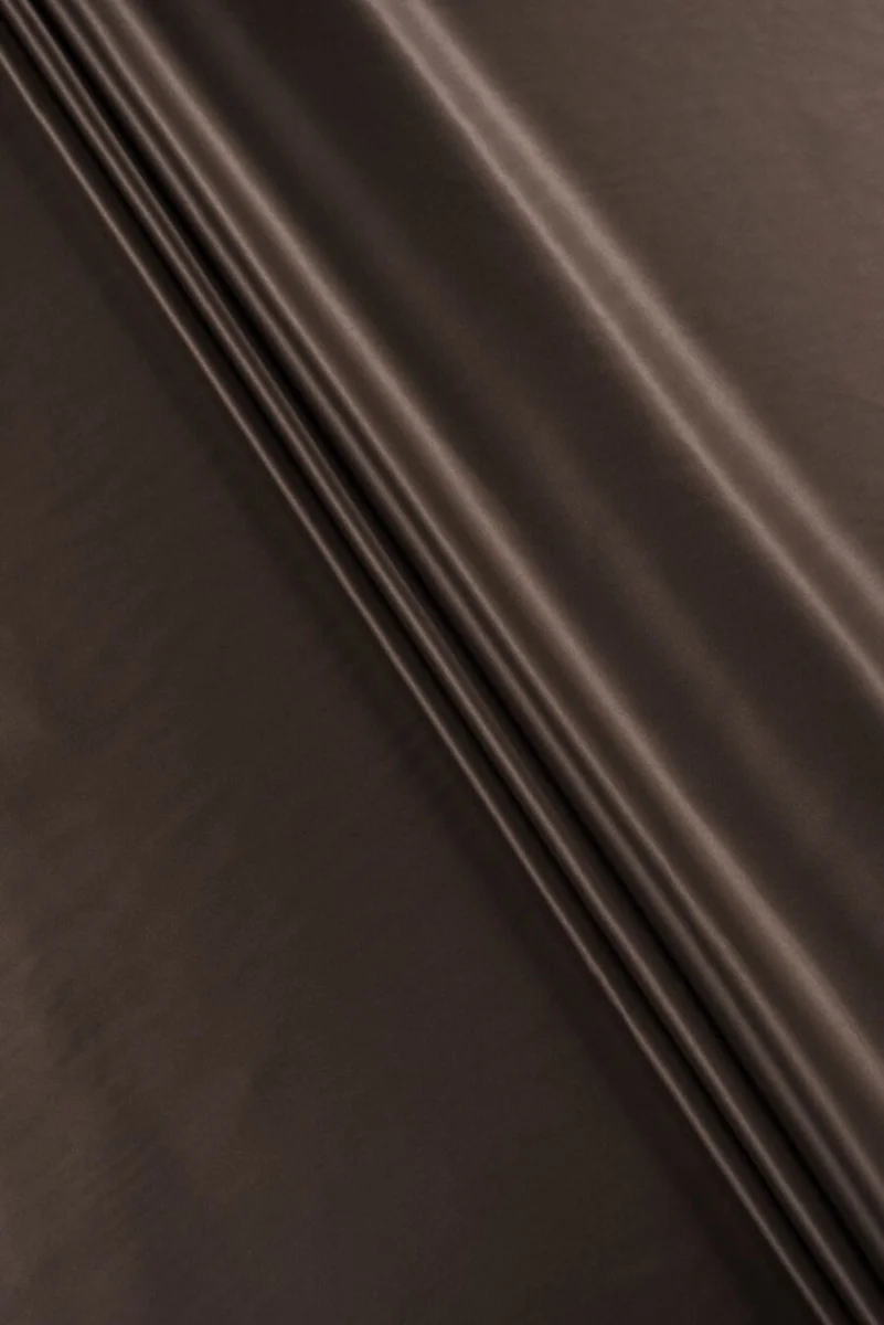 Włoska satyna jedwabna z dodatkiem elastanu w kolorze ciemnego brązu - gorzkiej czekolady. Tkanina jest zwiewana, lekka, elastyczna, lejąca i wykończona eleganckim połyskiem.
