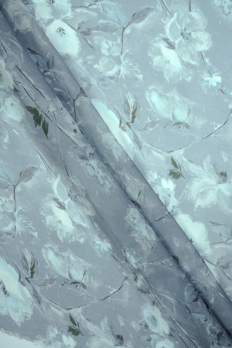 Włoski muślin utkany w 100% z jedwabiu naturalnego z motywem jasnych i delikatnych kwiatów. Subtelny nadruk roślinny wykonany jest w kolorze jasnej szarości i jasnego błękitu, idealnie łączy się z szaroniebieskim tłem. Tkanina jest wyjątkowo lekka i zwiewna oraz miękka i przyjemna dla skóry, co zapewnia luksusowy komfort noszenia. Materiał jest transparentny, dlatego wymaga zastosowania podszewki lub mocnego marszczenia dla uzyskania pożądanego krycia. Stonowany charakter tkaniny będzie doskonały dla osób lubiących romantyczne, a zarazem eleganckie wzornictwo. Tkanina z przeznaczeniem na zwiewne spódnice, eleganckie bluzki, koszule oraz luksusowe chustki i apaszki.
