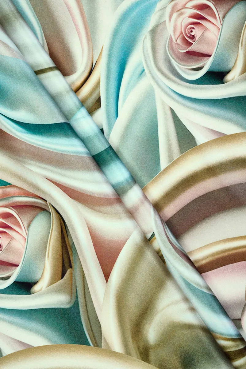 Włoska tkanina 100% jedwabna o satynowym splocie z motywem pastelowych pąków róży ułożonych z materiału. Kwiaty wypełniające całe tło wydają się niemal trójwymiarowe, jakby były lekko uniesione ponad powierzchnią tkaniny. Płatki mają łagodne, zaokrąglone formy i wyglądają, jakby były modelowane z jedwabiu. Materiał jest gładki, lekki, nieelastyczny, ma połyskującą powierzchnię oraz delikatnie odbija światło, nadając całości perłowy blask. Kolorystyka utrzymana w pastelowej palecie. Odcienie pudrowego różu, spokojnych zieleni: turkus o lekko przygaszonym, chłodnym tonie oraz oliwkowe akcenty dodające głębi i naturalności. Te barwy przenikają się łagodnie, bez ostrych kontrastów, tworząc spójną, kojącą kompozycję. To wzór niezwykle elegancki, a zarazem delikatny i eteryczny, idealny na zwiewne sukienki, bluzki czy dodatki o romantycznym, ponadczasowym stylu.