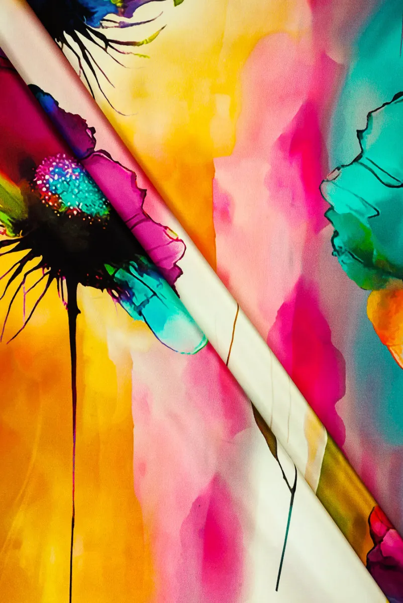 Włoska satyna 100% jedwabna zachwyca artystycznym charakterem i wyrazistą kompozycją. Jej powierzchnię zdobią duże, efektowne, kolorowe maki o imponujących rozmiarach – pojedynczy kwiat osiąga aż 27 × 26 cm, uzupełniony smukłą, podłużną łodygą o długości 26 cm. Motywy rozmieszczone są regularnie. Cieniowane tło w odcieniach pomarańczu, różu, turkusu i kremu przyciąga wzrok, a przenikające się barwy przypominają pociągnięcia akwareli, nadając materiałowi malarskiej głębi. Na tym ciekawym tle maki wybijają się intensywnymi, nasyconymi kolorami, tworząc efekt pełen energii i życia. Tkanina jest lejąca, nieelastyczna, ma szlachetny połysk, jedwabistą gładkość oraz pięknie układa się na sylwetce. Idealna propozycja do projektów, które mają przyciągać uwagę, dzięki połączeniu kolorów, skali wzoru i jakość materiału. Polecamy na sukienki, spódnice lub kimona.