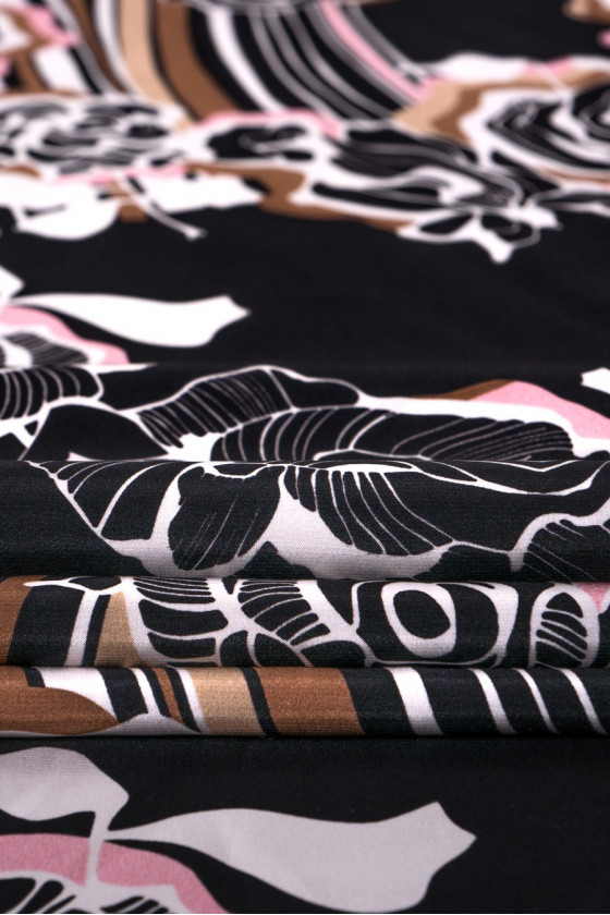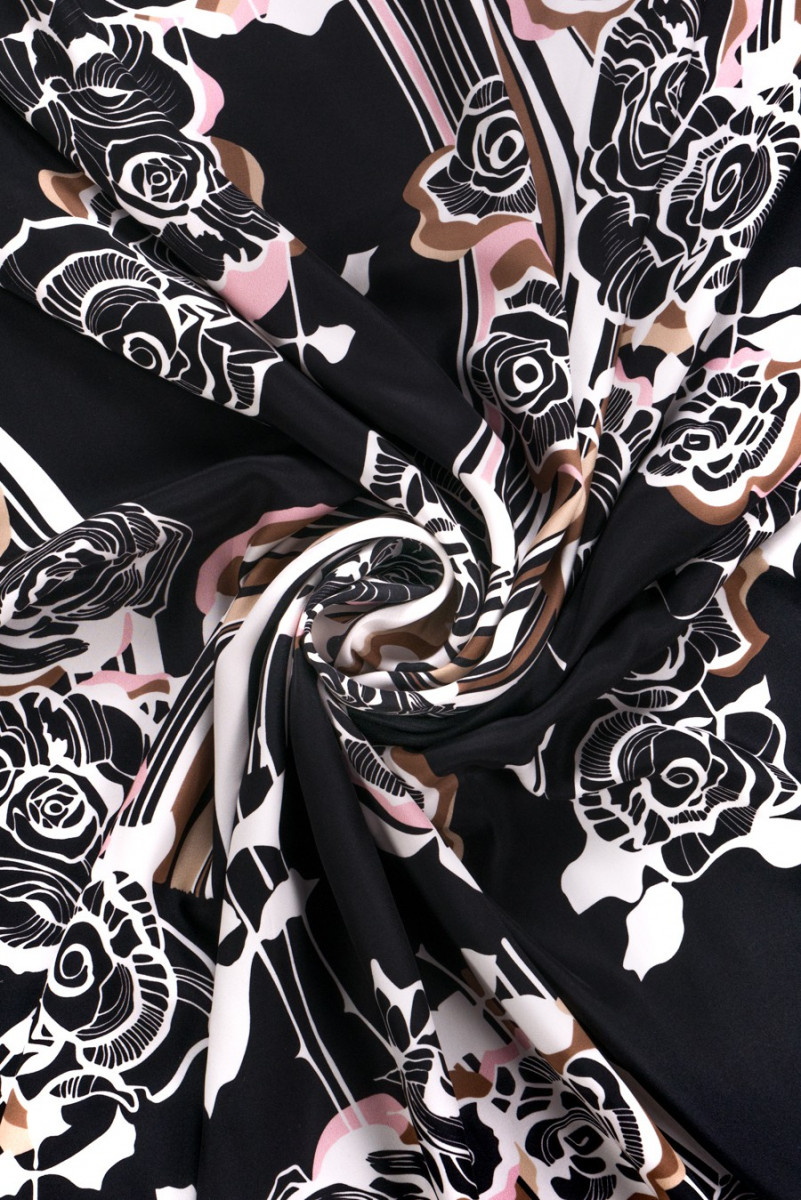 Włoska satyna 100% jedwabna w kolorze czarnym z gęstym nadrukiem kwiatów róży w kolorze bieli, beżu oraz jasnego różu. Całości dopełniają szerokie, falowane pasy w tej samej kolorystyce. Fantastyczna propozycja dla osób lubiących kwiatowe wzory w ciemnej kolorystyce.