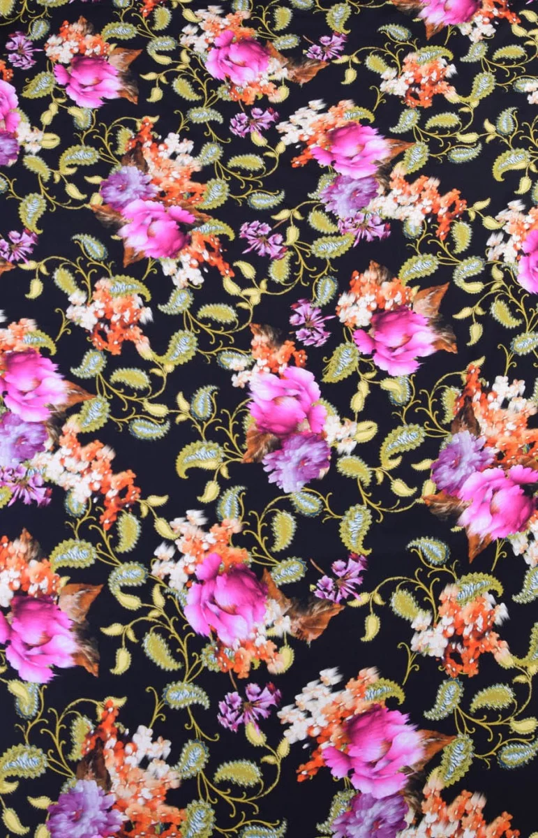 Włoska tkanina 100% jedwabna typu cadi w kolorze czarnym z motywem kolorowych kwiatów.