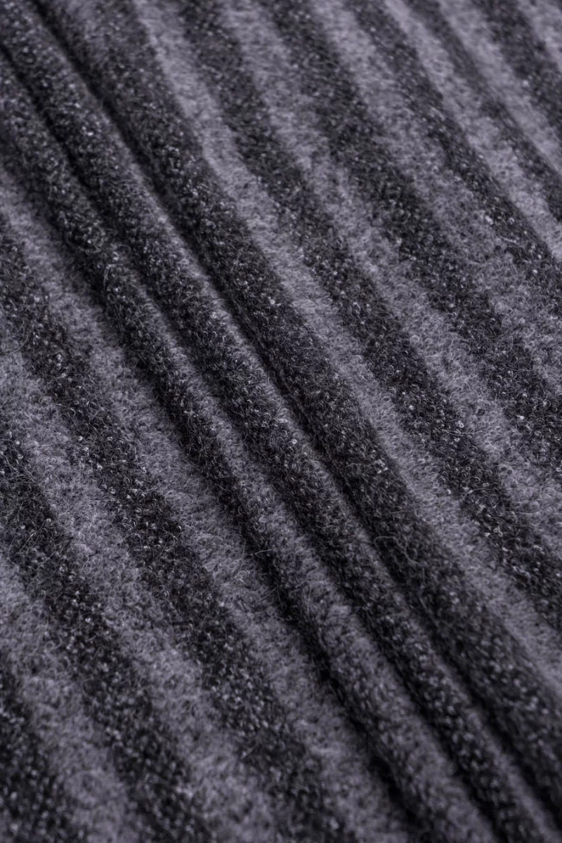 Włoska, grubsza dzianina swetrowa w paski w odcieniach szarości. Utkana z wełny naturalnej, moheru oraz akrylu. Miękka, grubsza, mięsista o zwartym splocie przypominającym boucle. Idealna na uszycie swetra, sukienki, zimowego szala.